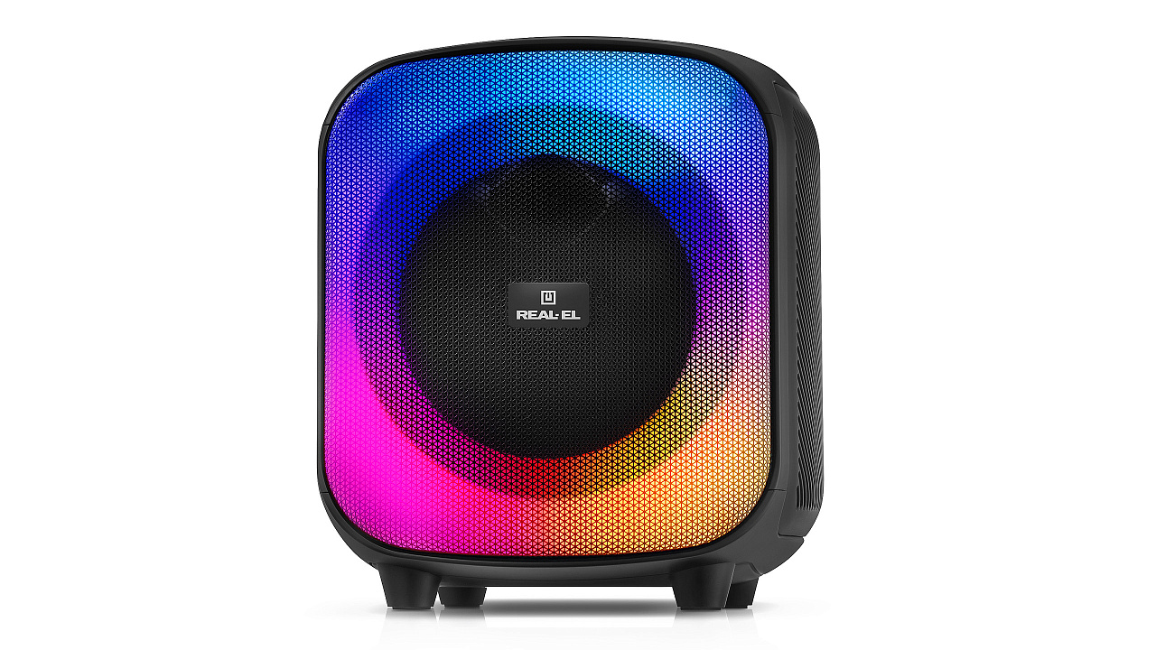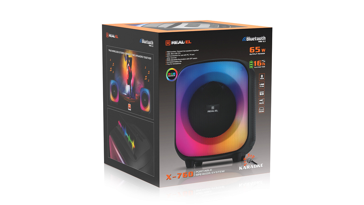 REAL-EL X-760 multimedia portable acoustic system features a modern design and high-quality sound. REAL-EL X-760 is a stylish, compact, and powerful boombox with RGB lighting and TWS functionality. REAL-EL X-760 is an excellent companion for outdoor and street.