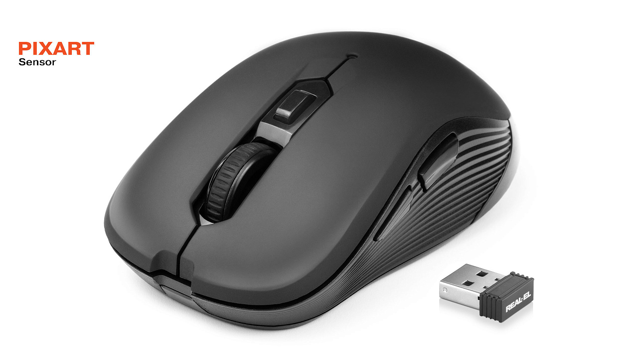Energy-efficient wireless technology allows the REAL-EL RM-331 W mouse to work on practically any surface. Features: 5 + 1 buttons, stylish ergonomic design, scroll wheel, resolution capability - 800/1200/1600 dpi, USB interface.