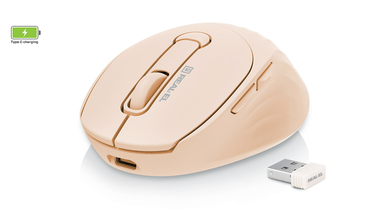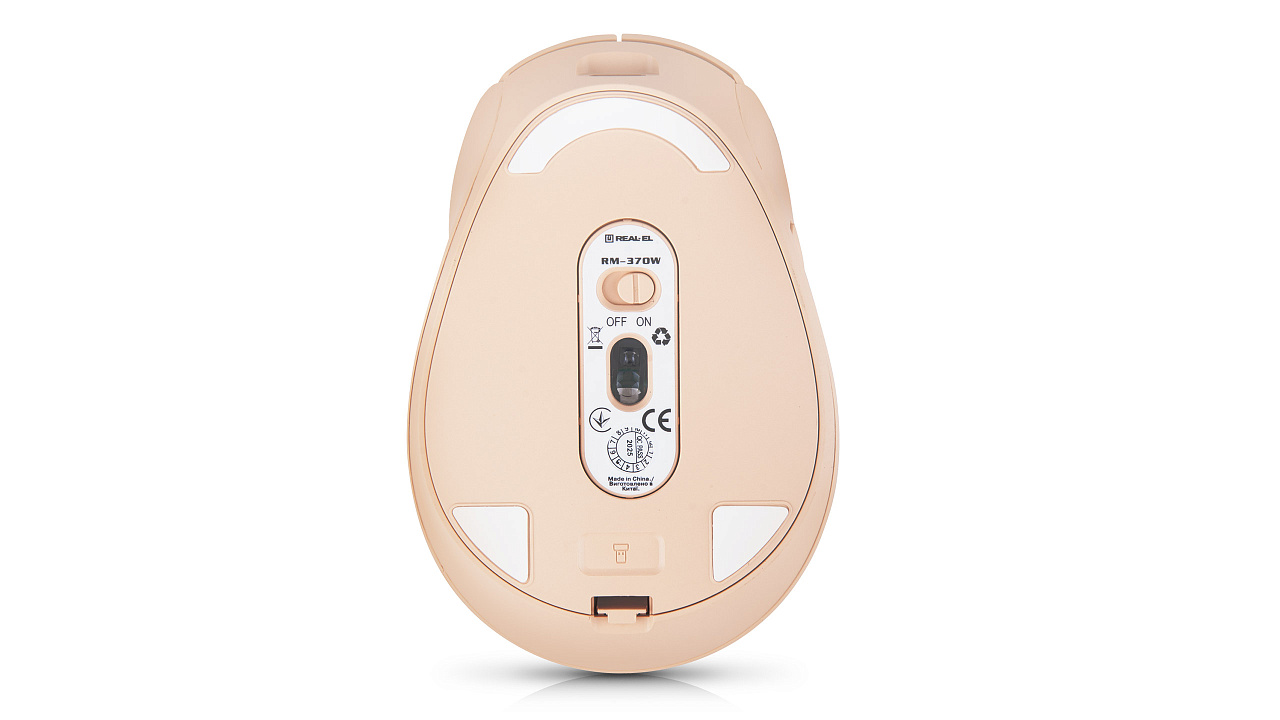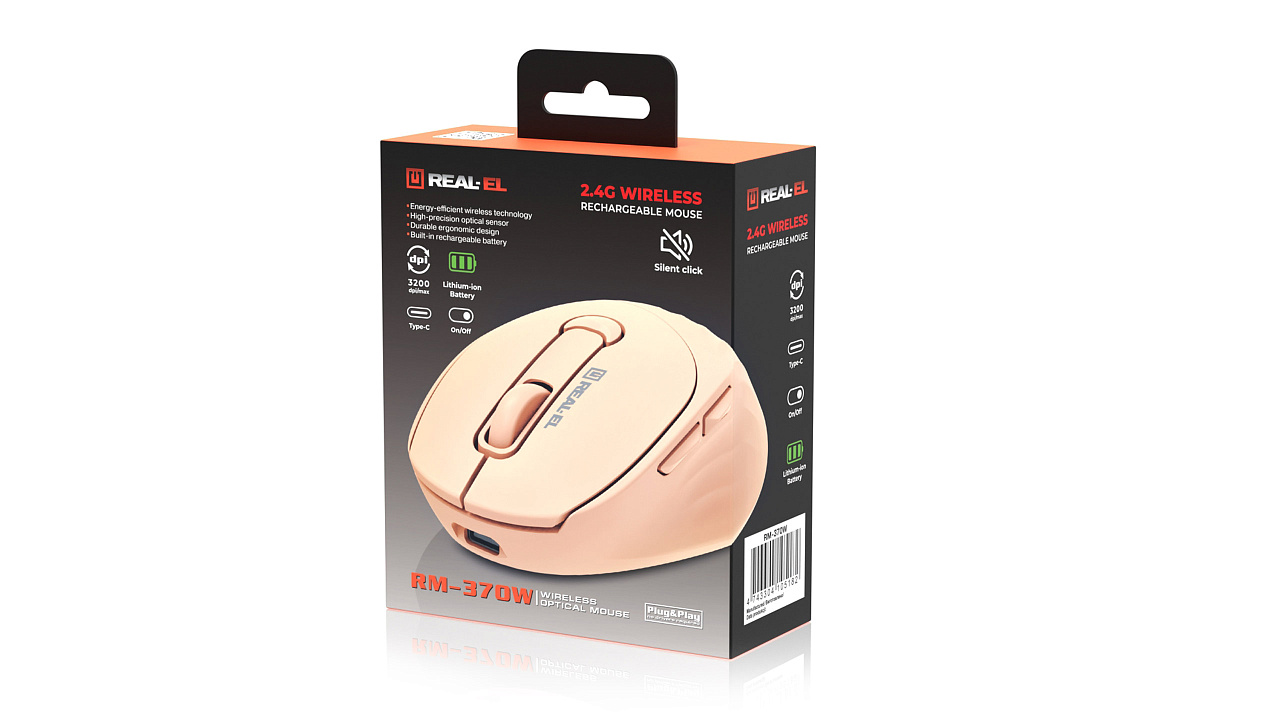 Energy-efficient wireless technology allows the REAL-EL RM-370W mouse to work practically on any surface. Features: 5 + 1 buttons, stylish ergonomic design, scroll wheel, resolution capability - 3200 dpi, USB interface, long battery life.