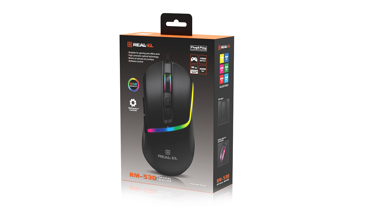 High-precision optical technology allows the computer mouse REAL-EL RM-530 to work practically on any surface. Features: high working speed, 5 + 1 buttons, scroll wheel, 2 navigation buttons "forward" and "backward", DPI resolution switch, built-in lighting with the ability to turn it off.
