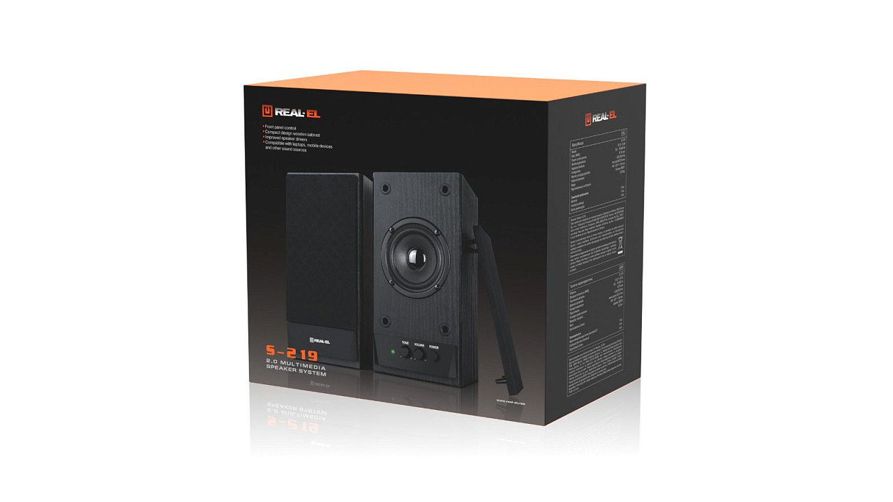 The REAL-EL S-219 2.0 USB Multimedia Speaker System is an easy and reasonable solution for your computer sound. In addition, the REAL-EL S-219 is compatibility with notebooks, mobile devices and other sound sources.