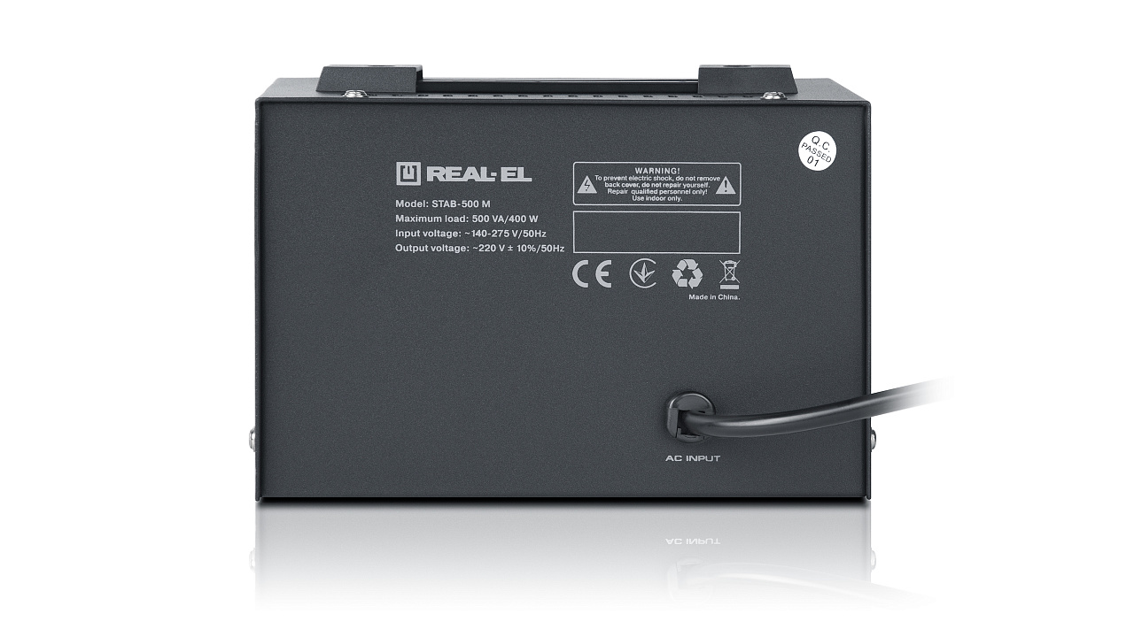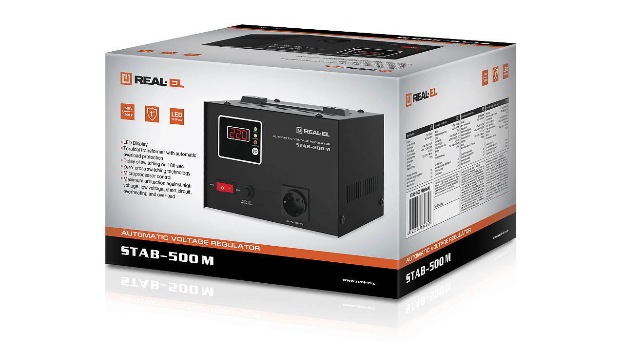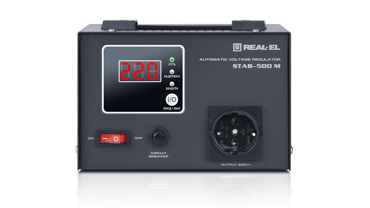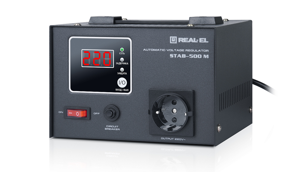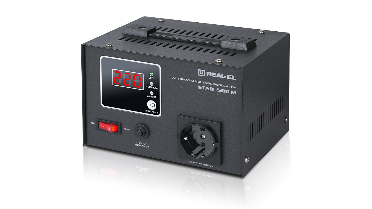 The REAL-EL STAB-500 M voltage stabilizer is designed to provide high-quality and stable power supply to various consumers in conditions of large deviations in voltage from the nominal value in terms of value and duration, protecting consumer devices from overload and the effects of high-frequency and impulse interference.