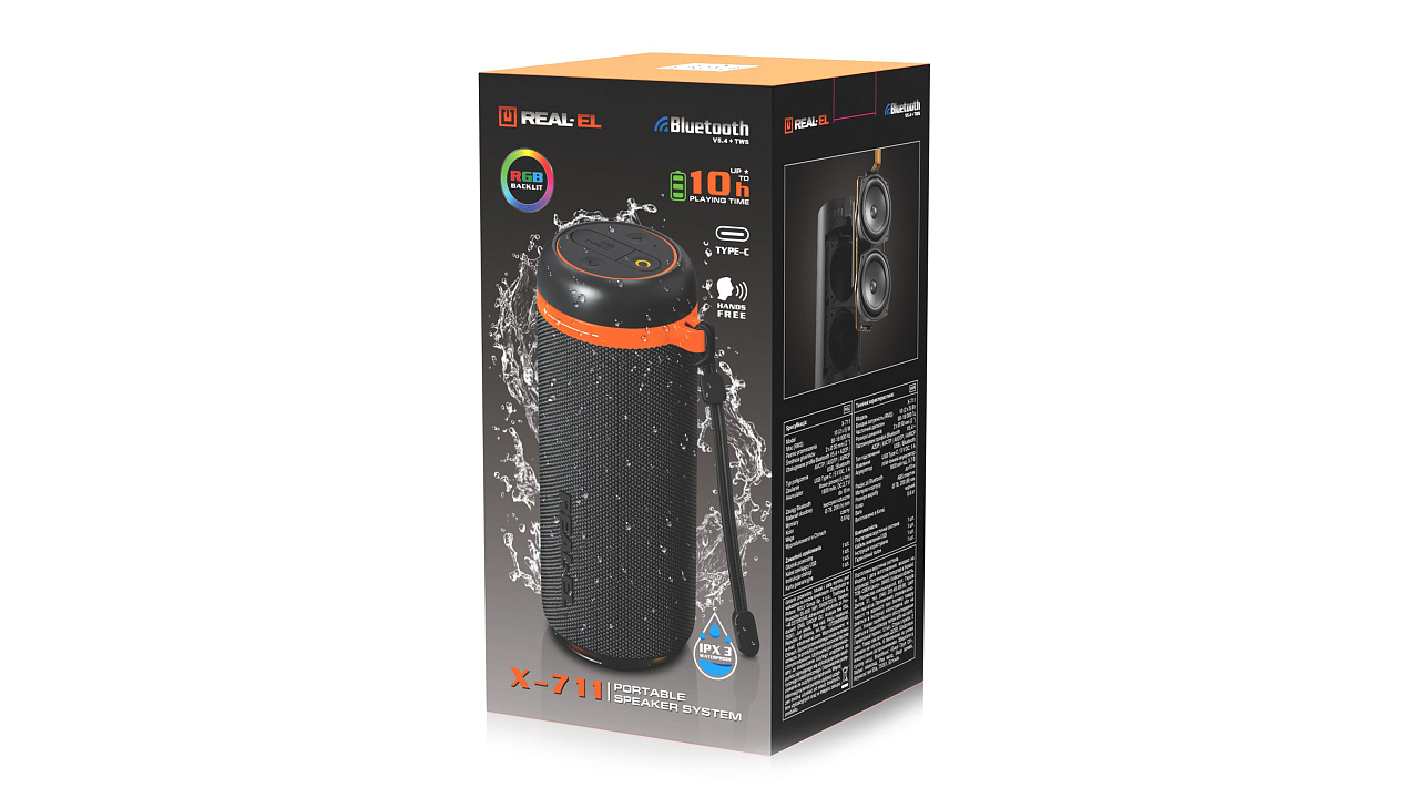 REAL-EL X-711 on 10 W kaasaskantav Bluetooth-kõlar, mis pakub selget ruumilist heli. Kõlari saab ühendada Bluetoothi või USB-mälupulga kaudu ja muusikat nautida.