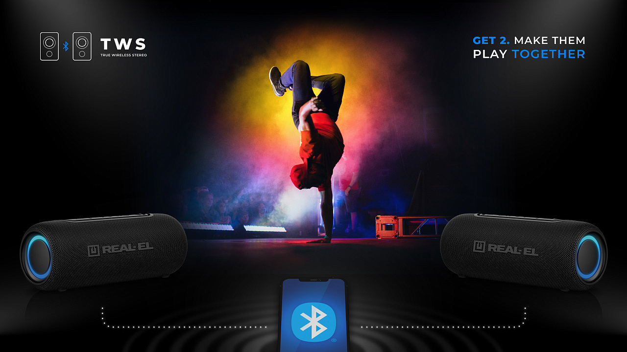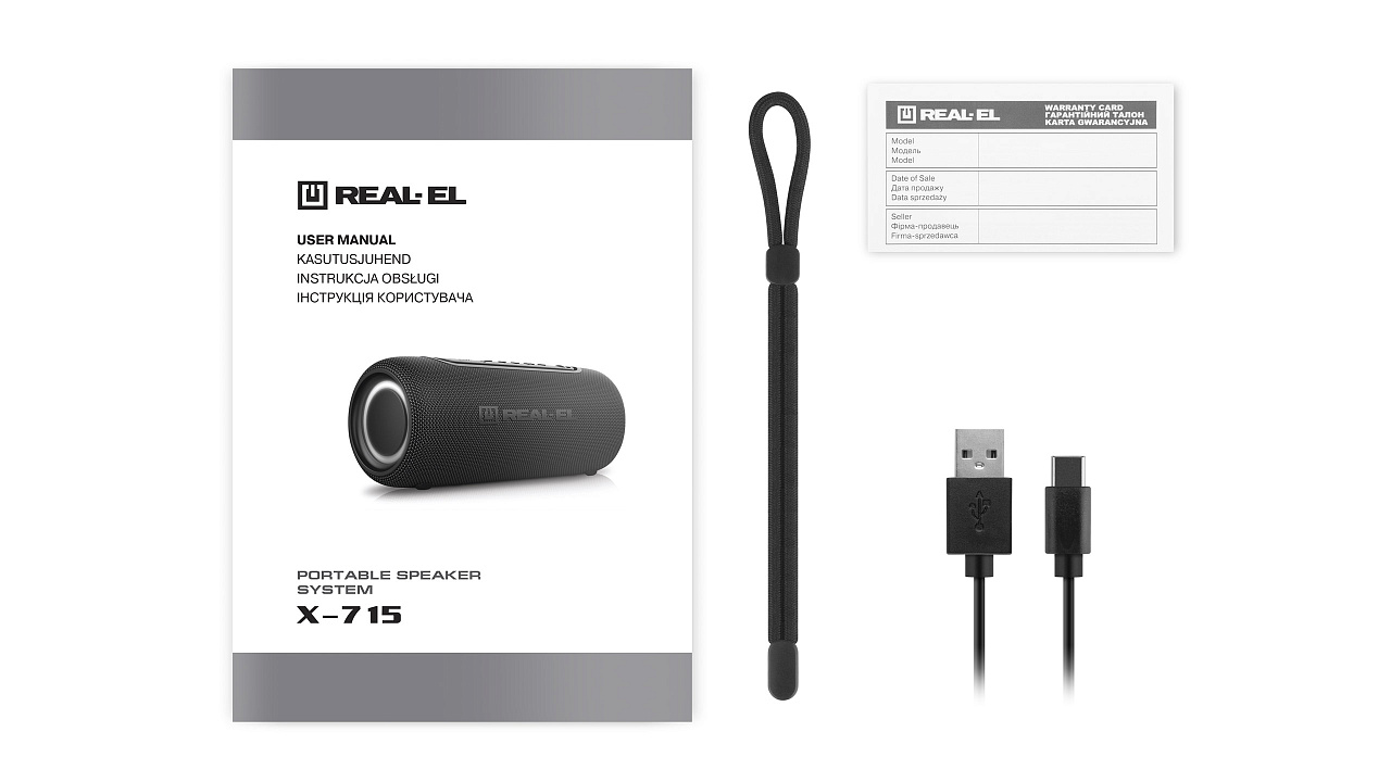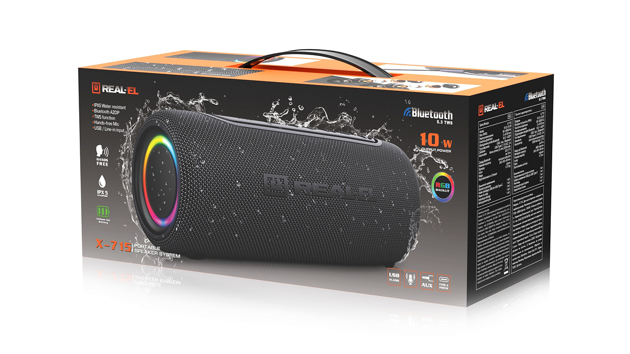 REAL-EL X-715 — sinu stiil, sinu muusika, sinu vabadus. REAL-EL X-715 on stiilne kaasaskantav kõlar, mis ühendab endas võimsa heli, elava RGB-valgustuse ja tõelise tegevusvabaduse. Sees on kaks kõlarit, mis pakuvad rikkalikku stereoheli sügava bassi ja selgete detailidega. Bluetooth 5.3 ühendub teie nutitelefoniga sekunditega ja TWS-režiim võimaldab teil ühendada kaks kõlarit tõeliseks stereosüsteemiks – topeltvõimsus kahekordse naudingu jaoks! Samuti on teil võimalus valida, kas ühendada muusika USB-mälupulgalt või AUX-i kaudu. Veelgi enam, hääleassistent ja sisseehitatud mikrofon võimaldavad teil kõnedele vastata käed-vabad, jättes teile täieliku liikumisvabaduse. IPX5 kaitse ei karda pritsmeid, seega on kõlar teiega piknikul, reisil, köögis või vannitoas. REAL-EL X-715 on 10 W võimas stereoheli, kuni 10 meetrit Bluetoothi leviala, kuni 10 tundi aku kasutusaega, mugav USB Type-C laadimine ja kaal vaid 750 g. REAL-EL X-715 — särav heli ja muljed ilma piirideta!