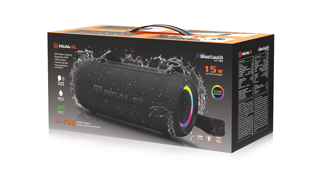 REAL-EL X-725 on IPX5 standardile vastav pritsmekindel – julgesti võtke see kööki, terrassile või vannituppa kaasa.