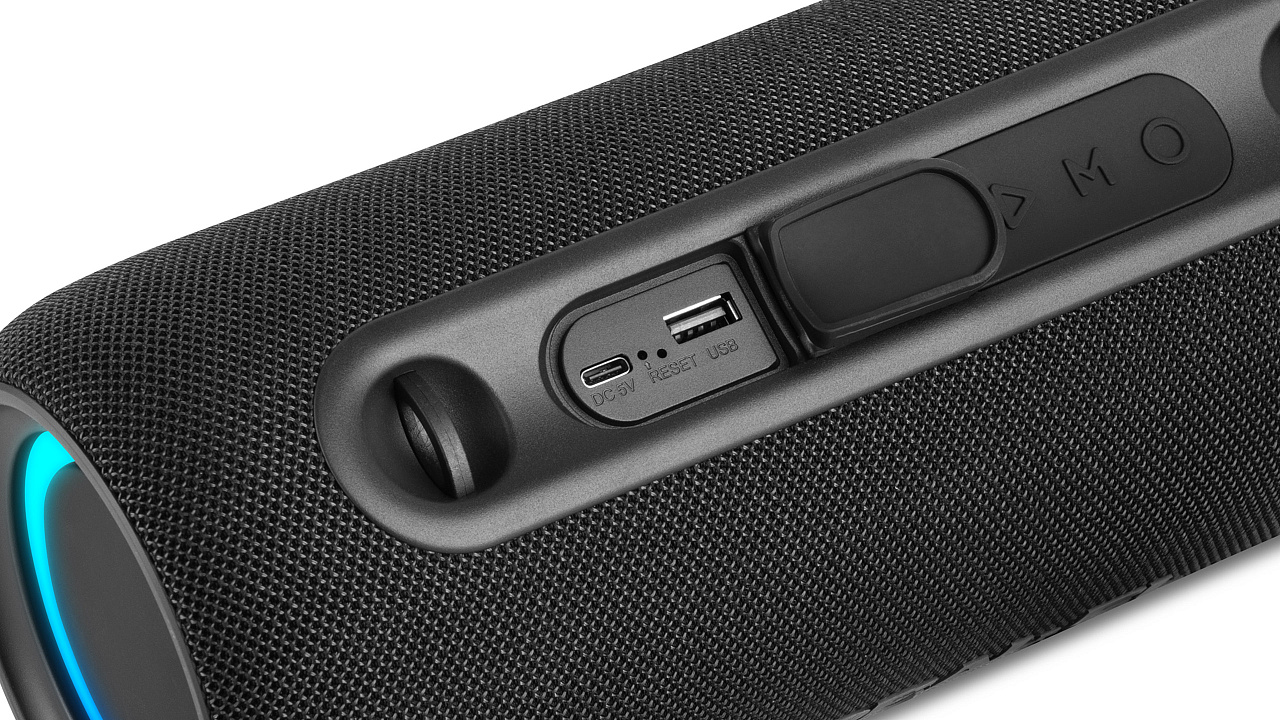 Taasesitus USB-mäluseadmetelt pic Sisseehitatud 3600 mAh aku pic Viies vedelikukaitseklass pic Võimaldab kahel eraldi Bluetooth-seadmel töötada stereorežiimis pic Käed-vabad tehnoloogia tugi pic Sisseehitatud mikrofon pic USB-C pesa pic Mitmevärviline taustavalgustus pic Tegevusraadius: 10 m pic Väljundvõimsus 15 W pic Bluetoothi versioon 5.3 pic