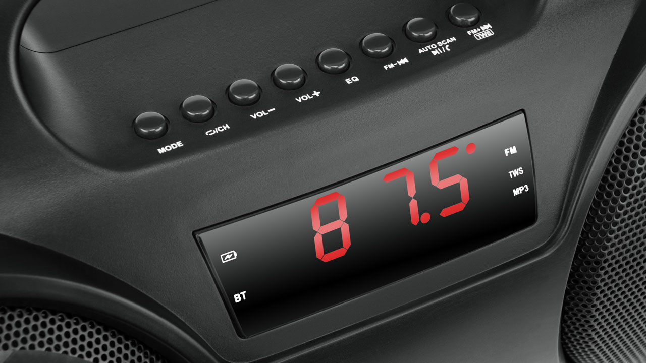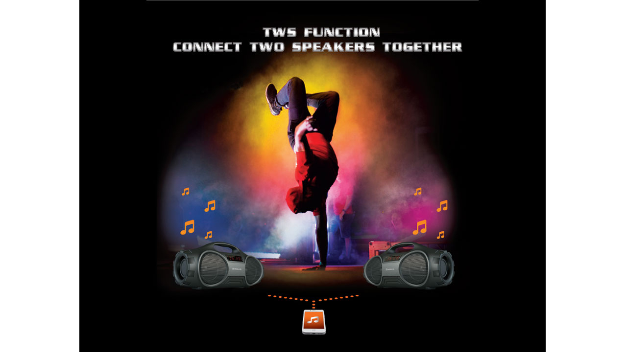 Taasesitus USB-mäluseadmetelt pic Sisseehitatud patarei pic Sisseehitatud raadio pic Taasesitus Mikro SD-kaartidelt pic AUX liini sisend pic Sisseehitatud ekvalaiser pic Võimaldab kahel eraldi Bluetooth-seadmel töötada stereorežiimis pic Väljundvõimsus 20 W pic Sisseehitatud Bluetooth moodul pic