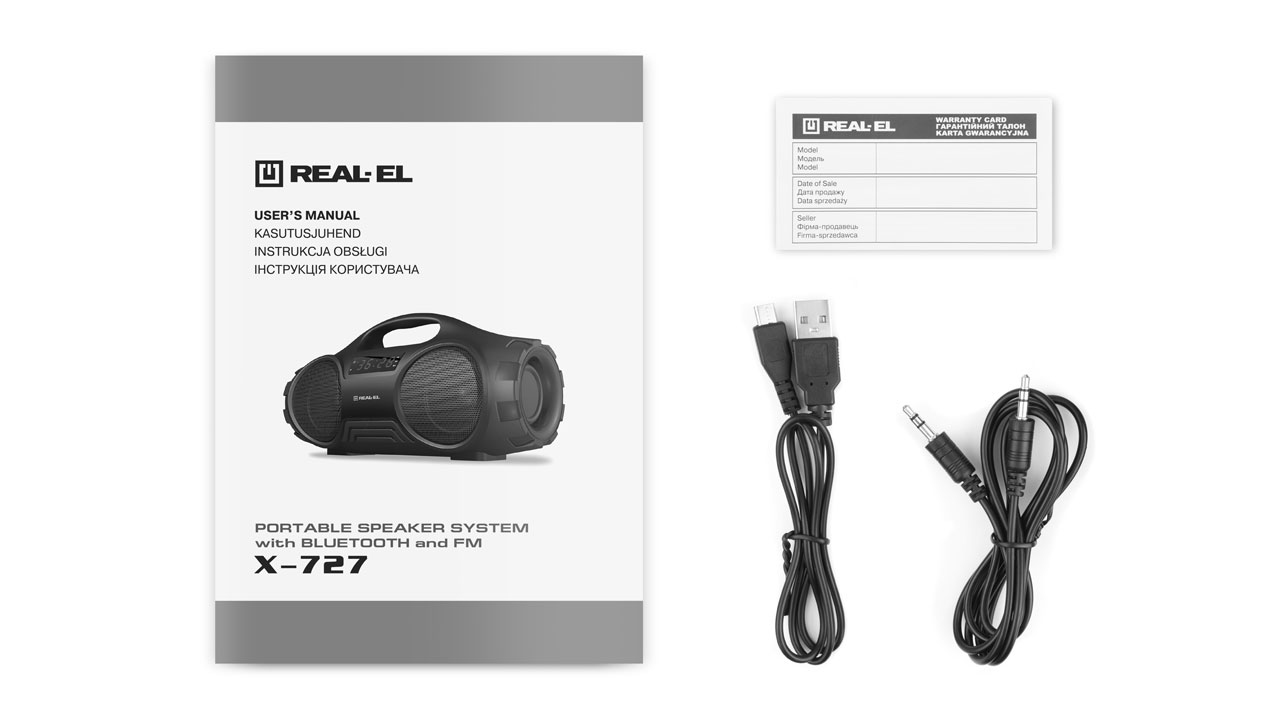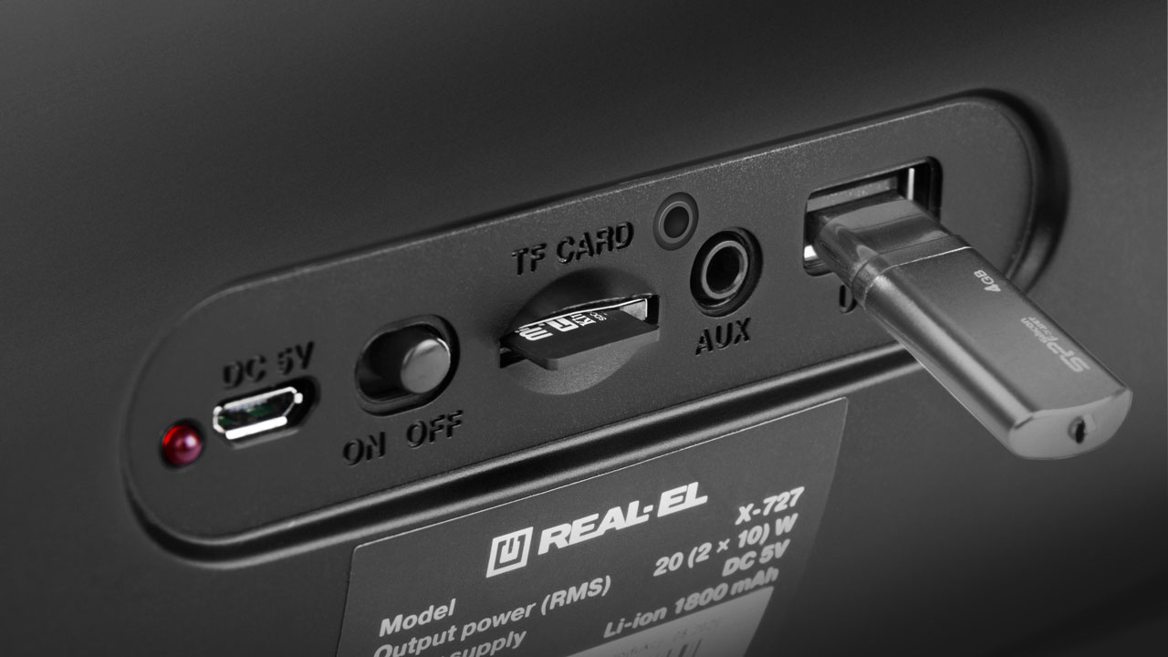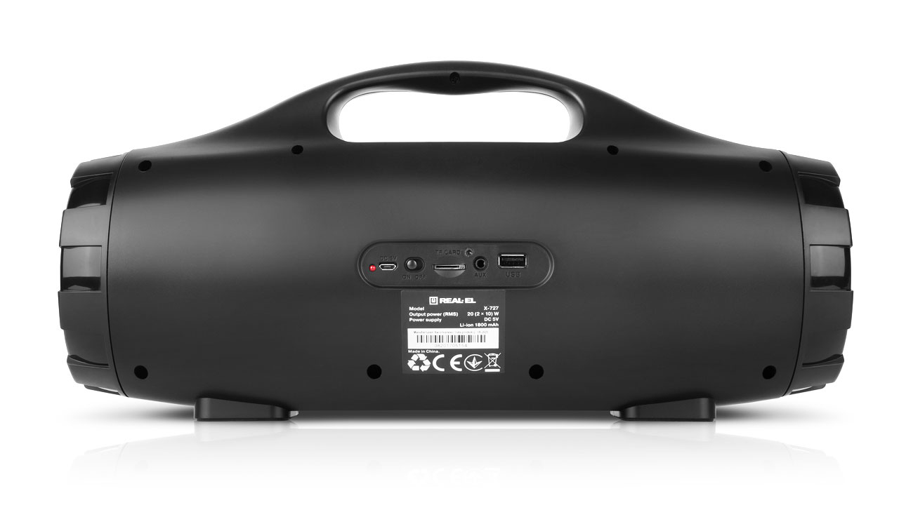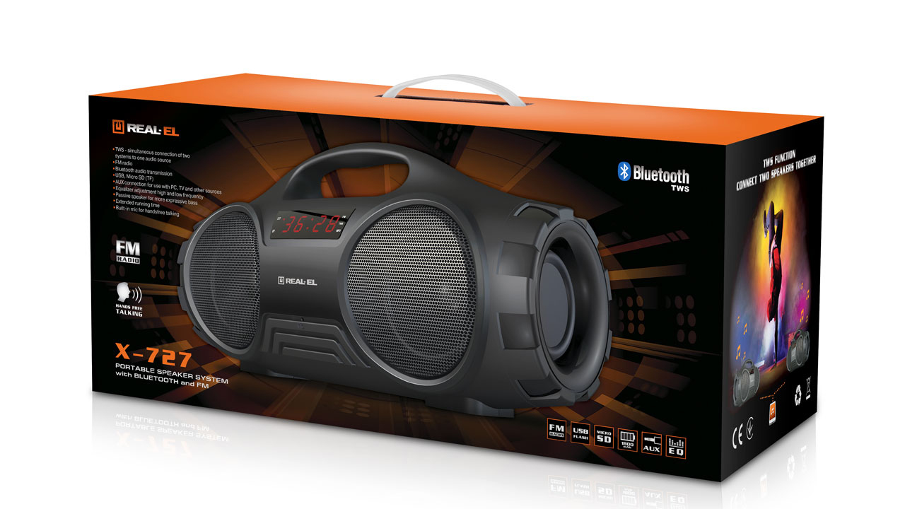 REAL-EL X-727 kaasaskantav bluetooth on kompaktne kaasaskantav kõlar, mis pakub juhtmevaba ühendust mistahes Bluetooth seadmega. Kaasaskantav kõlari võimaldab nautida heli igas ulatuses. Aseta lihtsalt seade toa keskele ja igaüks saab nautida erinevaid muusikapalasid. kindel konstruktsioon aitavad sul meeleolu luua kõikjal. Toetab: bluetooth (10m), USB-mälupulk, SD-kaart, AUX (3,5mm), FM-raadio, RGB taustvalgus.