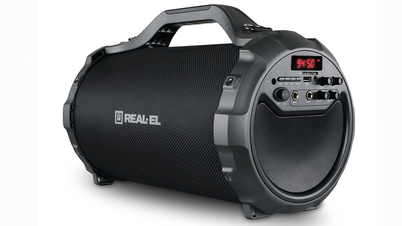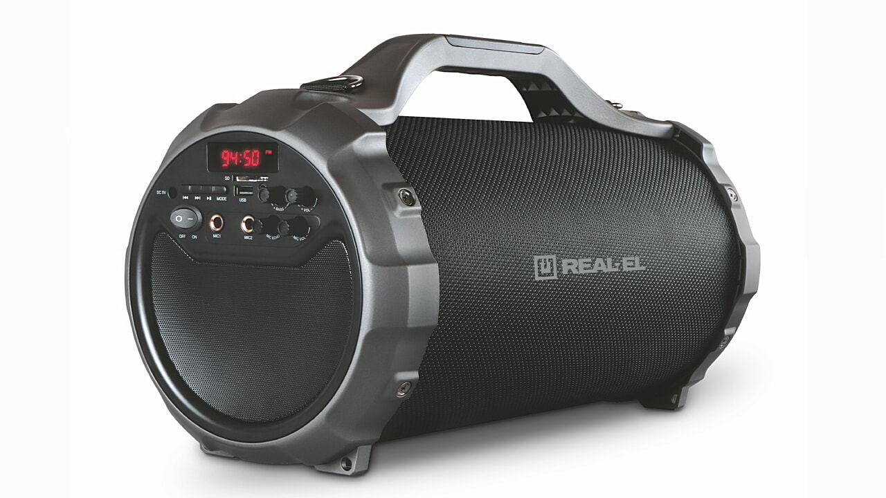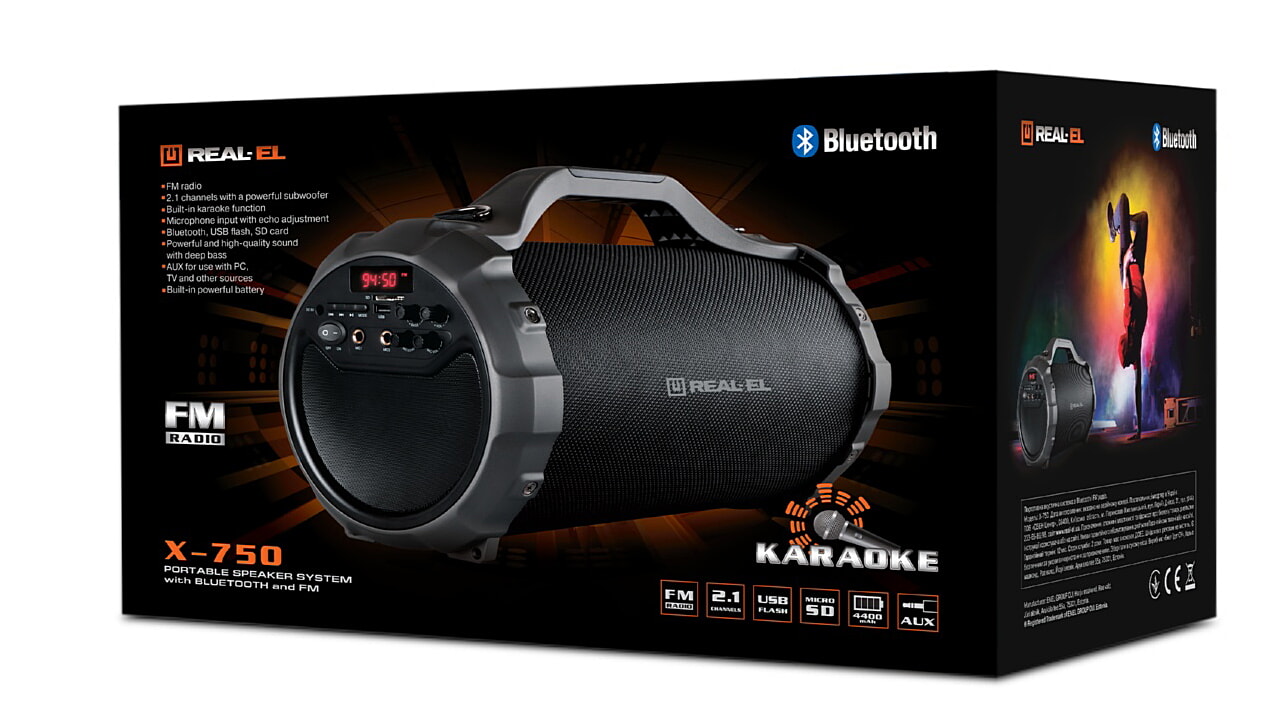 REAL-EL X-750 Kaasaskantav bluetooth on kompaktne kaasaskantav kõlar, mis pakub juhtmevaba ühendust mistahes Bluetooth seadmega. Tänu laetavale akule võib kõlar mängida kuni 12 tundi järjest. Kaasaskantav kõlari võimaldab nautida heli igas ulatuses. Aseta lihtsalt seade toa keskele ja igaüks saab nautida erinevaid muusikapalasid. kindel konstruktsioon aitavad sul meeleolu luua kõikjal. Toetab: bluetooth (10m), USB-mälupulk, SD-kaart, AUX (3,5mm), FM-raadio, karaoke funktsioon.