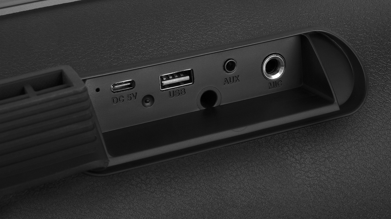 Taasesitus USB-mäluseadmetelt pic Sisseehitatud patarei pic Ühendamine USB-C abil pic LED-taustavalgustus pic AUX liini sisend pic Võimaldab kahel eraldi Bluetooth-seadmel töötada stereorežiimis pic Kajafunktsiooniga mikrofoni sisend pic Tegevusraadius: 10 m pic Väljundvõimsus 70 W pic Bluetoothi versioon 5.3 pic Tööaeg kuni 10 tundi pic Bassivõimendi pic