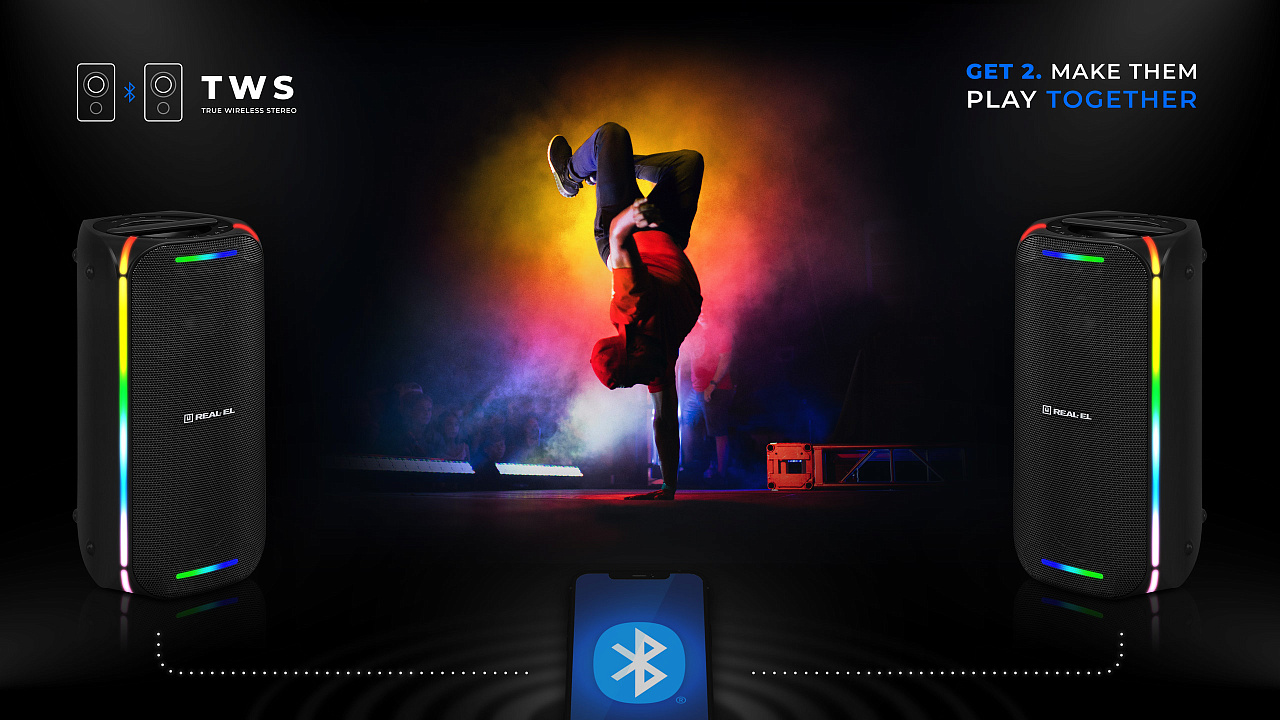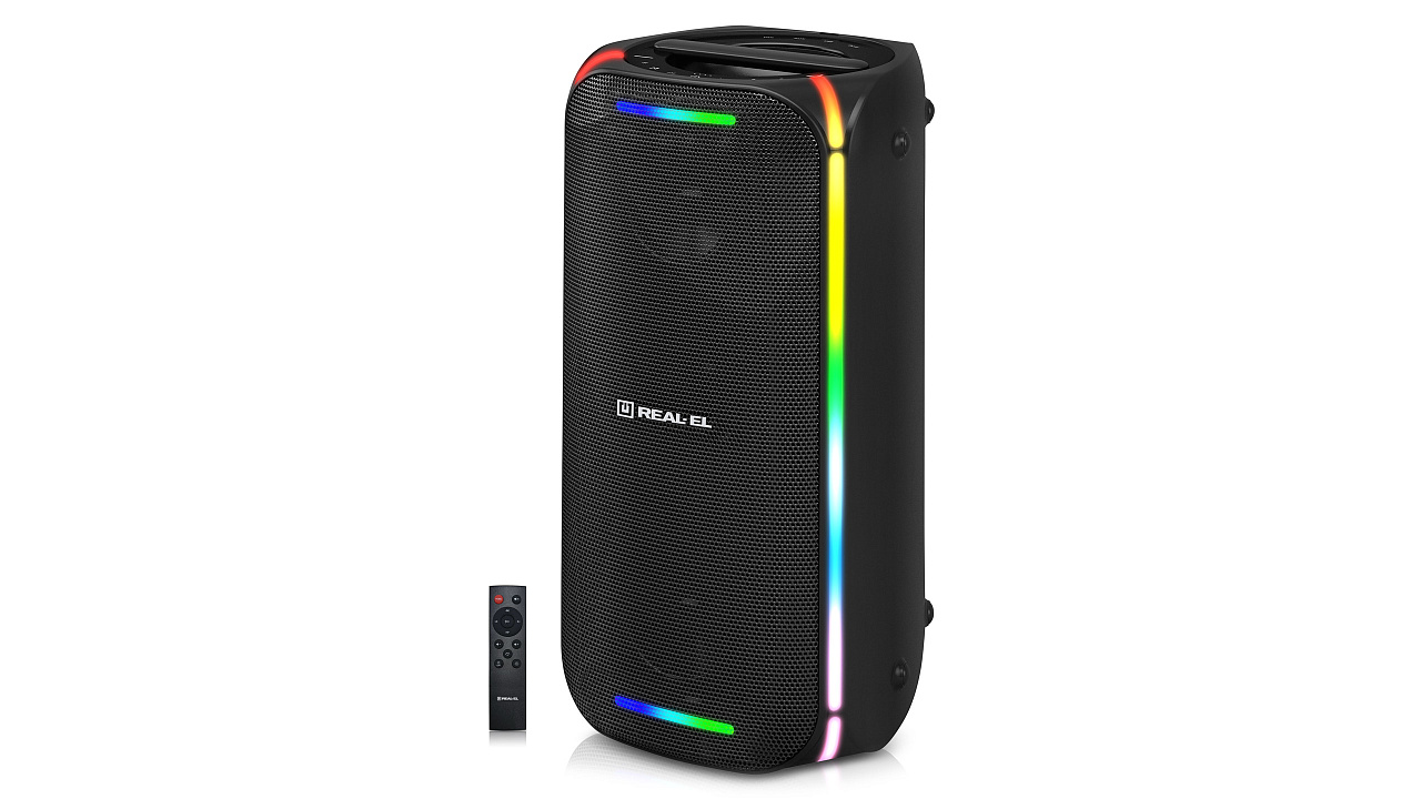 REAL-EL X-775 on stiilne, kompaktne ja võimas boombox RGB valgustuse ja TWS funktsiooniga.