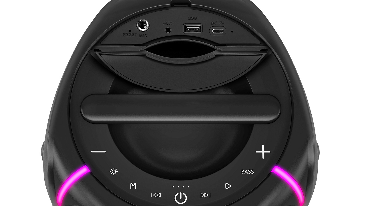Taasesitus USB-mäluseadmetelt pic Sisseehitatud patarei pic Ühendamine USB-C abil pic LED-taustavalgustus pic AUX liini sisend pic Võimaldab kahel eraldi Bluetooth-seadmel töötada stereorežiimis pic Kajafunktsiooniga mikrofoni sisend pic Väljundvõimsus 80 W pic Tegevusraadius: 10 m pic Bluetoothi versioon 5.3 pic Tööaeg kuni 9 tundi pic Bassivõimendi pic
