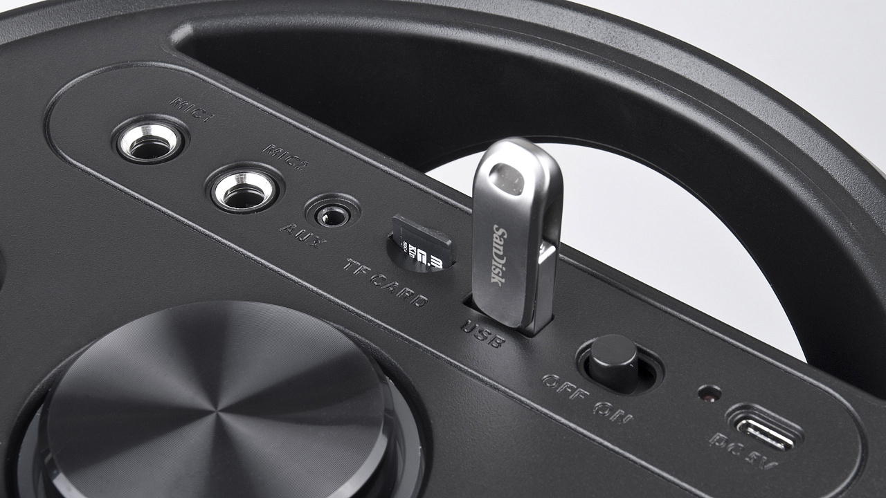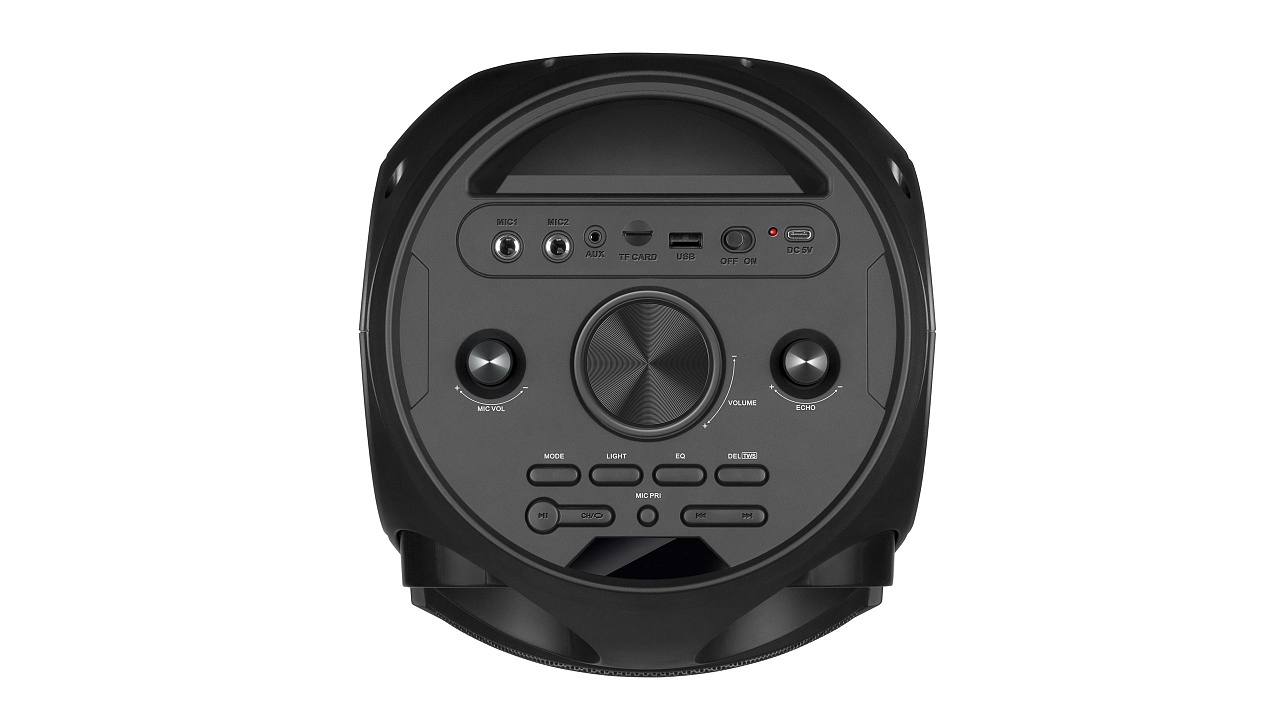 Sisseehitatud 4000 mAh aku pic Taasesitus Mikro SD-kaartidelt pic AUX liini sisend pic Sisseehitatud ekvalaiser pic Võimaldab kahel eraldi Bluetooth-seadmel töötada stereorežiimis pic Kaks mikrofonisisendit pic Väljundvõimsus 80 W pic Tööaeg kuni 8 tundi pic Mitmevärviline taustavalgustus pic Tegevusraadius: 10 m pic Bluetoothi versioon 5.3 pic