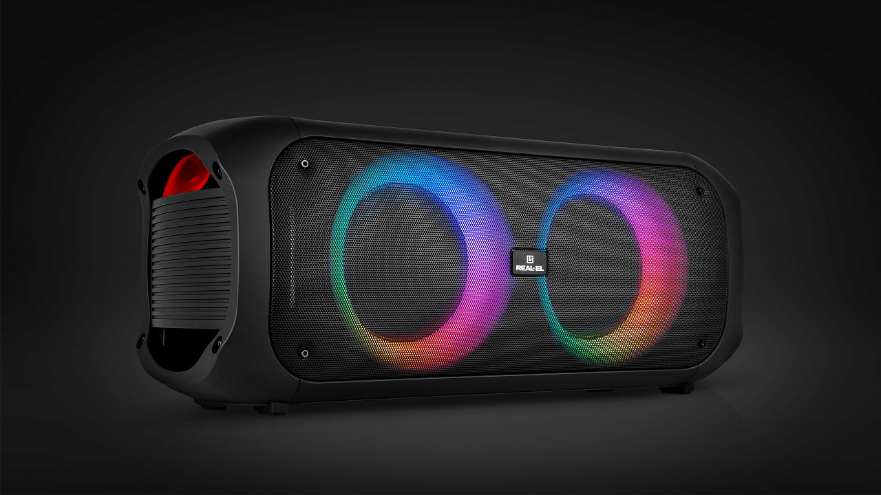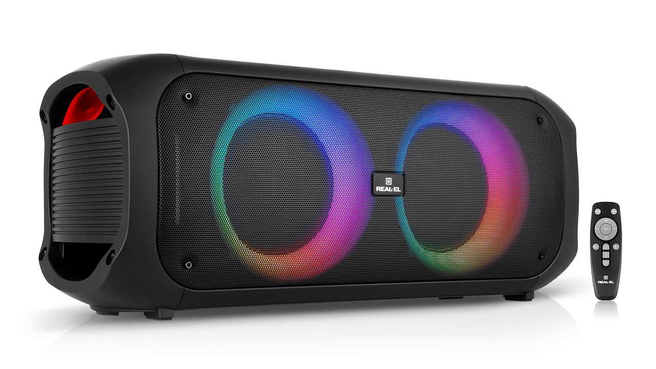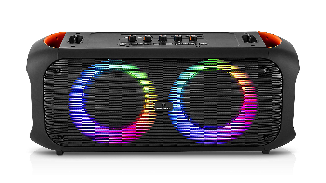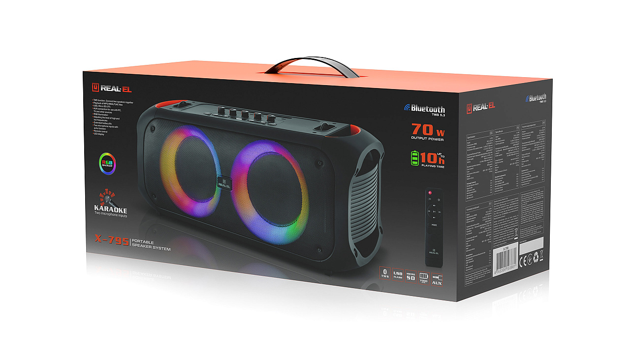 REAL-EL X-795 — võimas stiil ja iseloom! REAL-EL X-795 on võimas 70W kaasaskantav kõlar kahe Ø 6,5-tollise kõlari ja kahe Ø 3,5-tollise kõrgsageduskõlariga, mis pakuvad sügavat bassi, elavaid kesksagedusi ja selgeid kõrgsagedusi uskumatult kaasahaarava heli loomiseks. Ideaalne nii kodupidudeks kui ka õueüritusteks, võta see endaga kõikjale kaasa. Ühenda nutitelefon Bluetoothi kaudu, sisesta mälupulk või mälukaart, kasuta AUX-ühendust – sul on alati valida, kuidas oma lemmikmuusikat kuulata. Kui tahad veelgi rohkem heli – aktiveeri TWS-režiim, ühenda kaks kõlarit üheks juhtmevabaks 140 W stereosüsteemiks. RGB-valgustus nii kõlarite ümber kui ka külgedel lisab meeleolu, luues iga looga tõelise etenduse. Kaks mikrofonisisendit helitugevuse reguleerimise ja kajaefektiga muudavad X-795 suurepäraseks lahenduseks karaoke, ürituste korraldamiseks või hääle edastamiseks. Kõlar töötab kuni 10 tundi tänu 51.8 Wh akule, laadimine toimub USB Type-C kaudu ning seda saab juhtida käsitsi või puldiga. REAL-EL X-795 – heli, mis annab energiat!