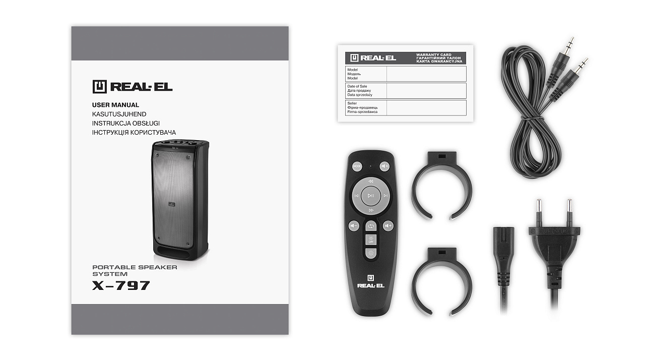 REAL-EL X-797 — maksimaalne võimsus ja energia! REAL-EL X-797 on kaasaskantav kõlar uskumatu 90W võimsusega, mis avaldab muljet kahe 8-tollise kõlari, kahe 2,5-tollise kõrgsageduskõlari, rikkaliku megabassi, elavate keskmiste ja selgete kõrgete sagedustega – kõik see kaasahaarava ja veatu helikogemuse tagamiseks. Korralda tõeline pidu kodus või õues – heli jätkub kõigile! Ühenda Bluetooth′i, USB, microSD või AUX′i kaudu – sinu muusika on alati sinuga. Kas tahad veelgi rohkem? Aktiveeri TWS ja ühenda kaks süsteemi üheks stereopaariks, et võimsust kahekordistada! Kaks mikrofonisisendit kajafunktsiooni ja karaokerežiimiga muudavad teie peo tõeliseks kontserdiks. Dünaamiline RGB-taustvalgustus 5 efektirežiimiga valgustab kogu REAL-EL X-797 esipaneeli, luues igal peol hämmastava atmosfääri. Toide on võimalik nii 230 V võrgust kui ka sisseehitatud 88,8 Wh akust – kuni 7 tundi autonoomset tööd. Kaugjuhtimispult tagab täieliku kontrolli. REAL-EL X-797 — täis energiat ja lõbusaid elamusi.