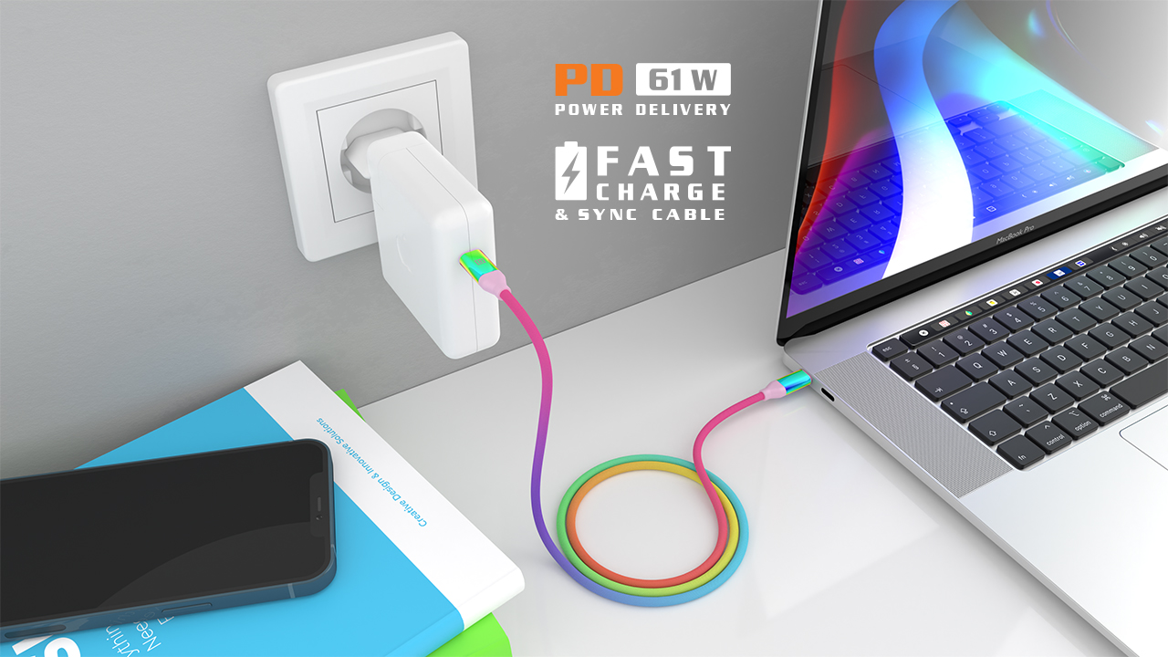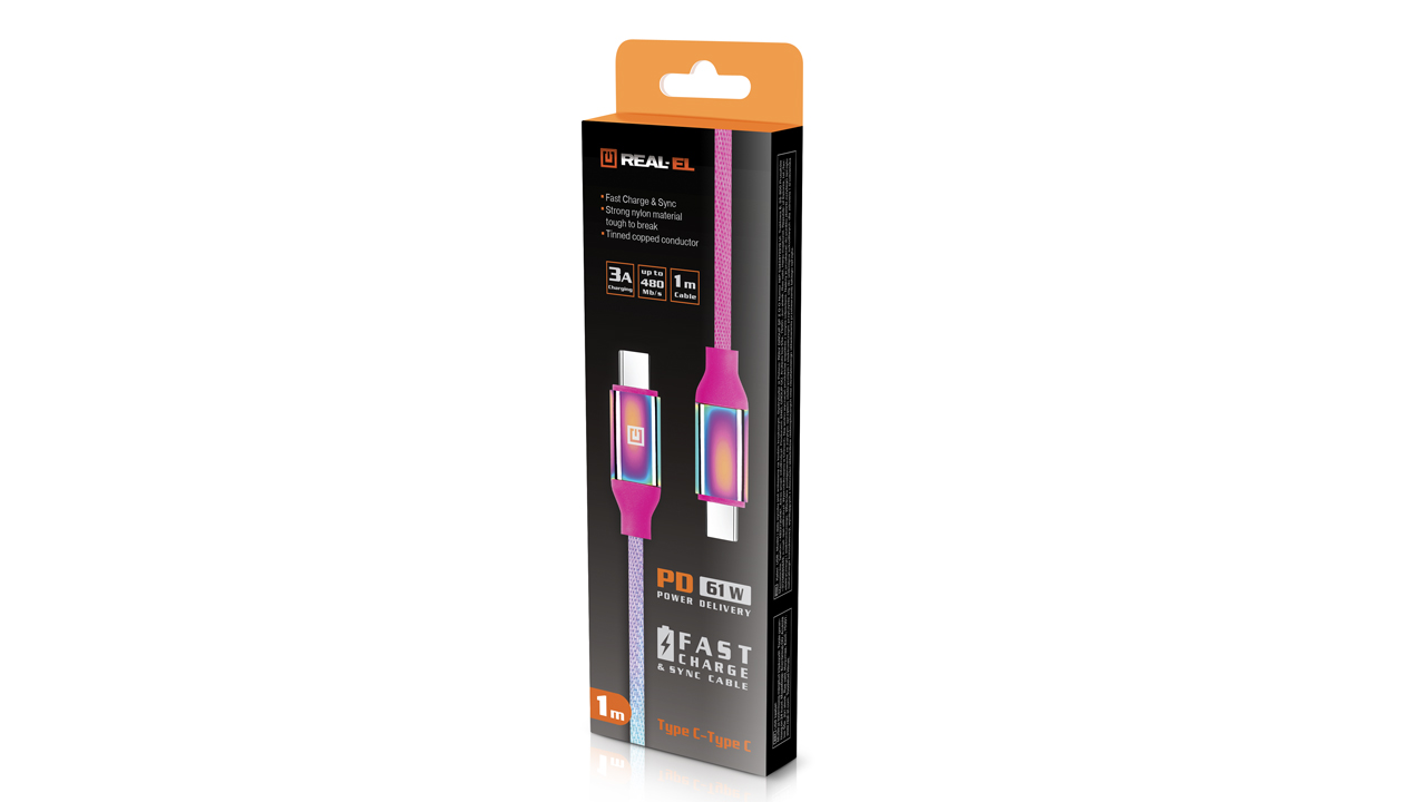REAL-EL Premium USB Type C - Type C Rainbow kaabel on mõeldud digitaalsete seadmete ühendamiseks laadimiseks ja andmeedastuseks.