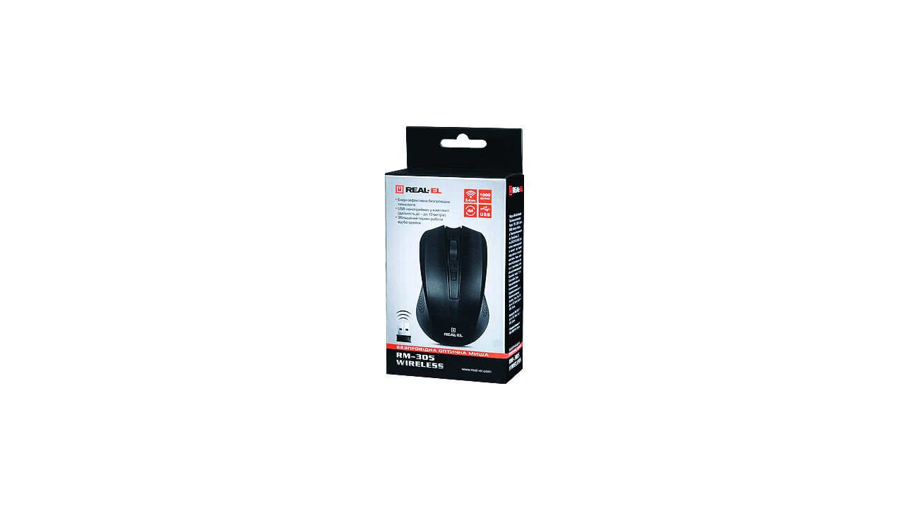 Energiaefektiivne juhtmevaba tehnoloogia võimaldab manipulaatoril REAL-EL RM-305 Wireless töötada praktiliselt igal pinnal. Eriomadused: 3 + 1 klahvi, stiilne ergonoomiline disain, kerimisratas, DPI eraldusvõime ümberlülitamise nupp, USB-liides, patareide pikendatud töövältus.