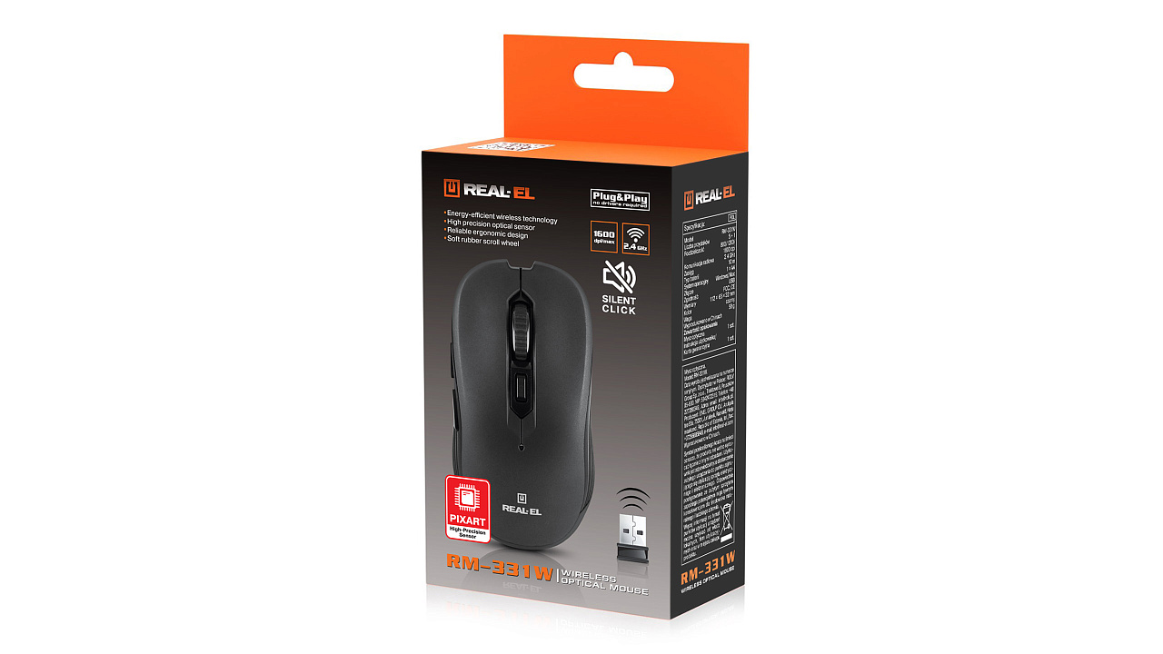 Energiatõhus juhtmevaba tehnoloogia võimaldab REAL-EL RM-331 W hiirel praktiliselt kõigil pindadel töötada. Omadused: 5 + 1 nuppu, stiilne ergonoomiline disain, kererull, eraldusvõime - 800/1200/1600 dpi, USB-liides.