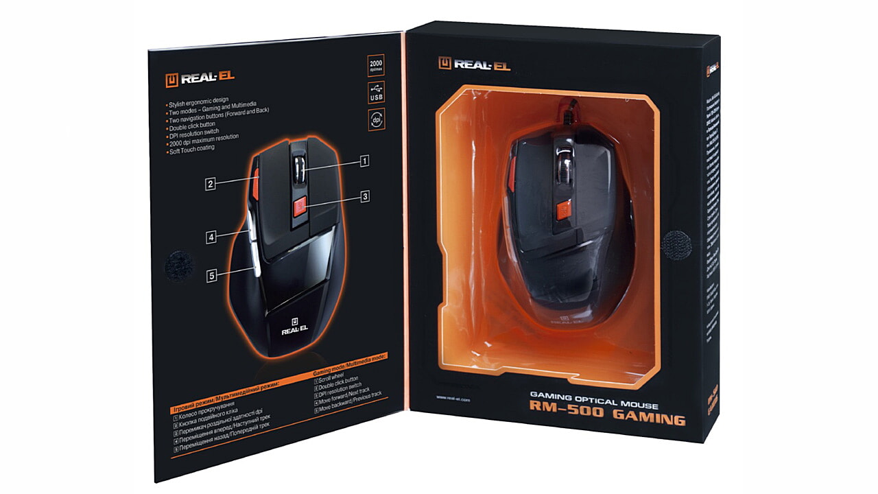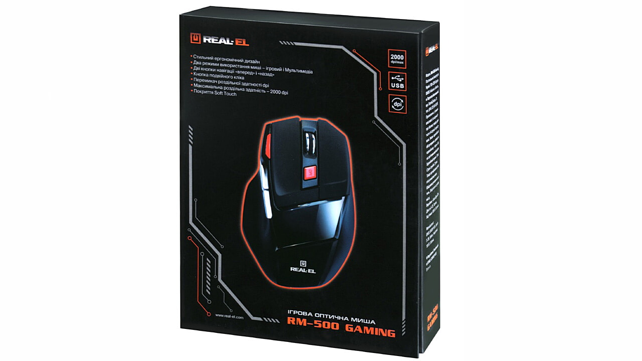 Ülitäpne optiline tehnoloogia võimaldab arvutihiirel REAL-EL RM-500 Gaming töötada praktiliselt igal pinnal. Eriomadused: stiilne ergonoomiline disain, kaks hiire kasutamise režiimi – mänguline ja multimeedia, 6 + 1 klahvi, topeltklõpsu nupp, kaks navigatsiooninuppu «edasi» ja «tagasi», DPI eraldusvõime ümberlüliti, hiire maksimaalne eraldusvõime – 2000 dpi, kullatud USB-liides, seadme loomulik ehitus on kätele mugav, manipulaatori massiivsem konstruktsioon.