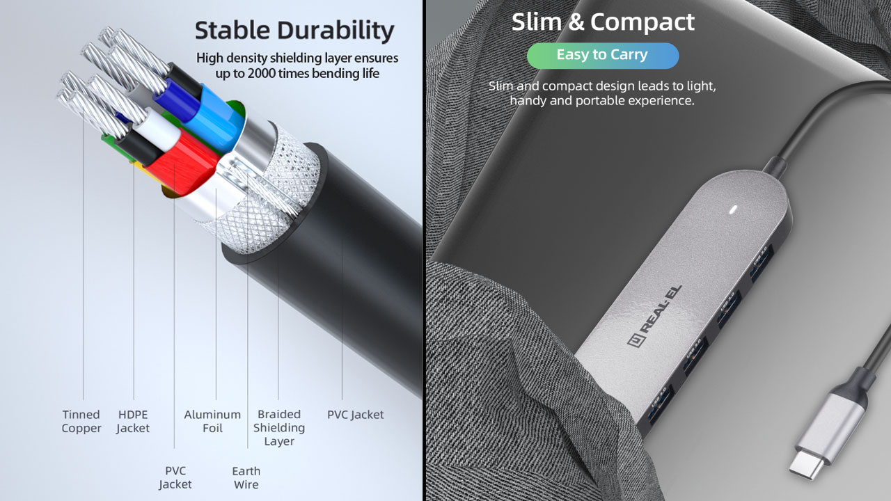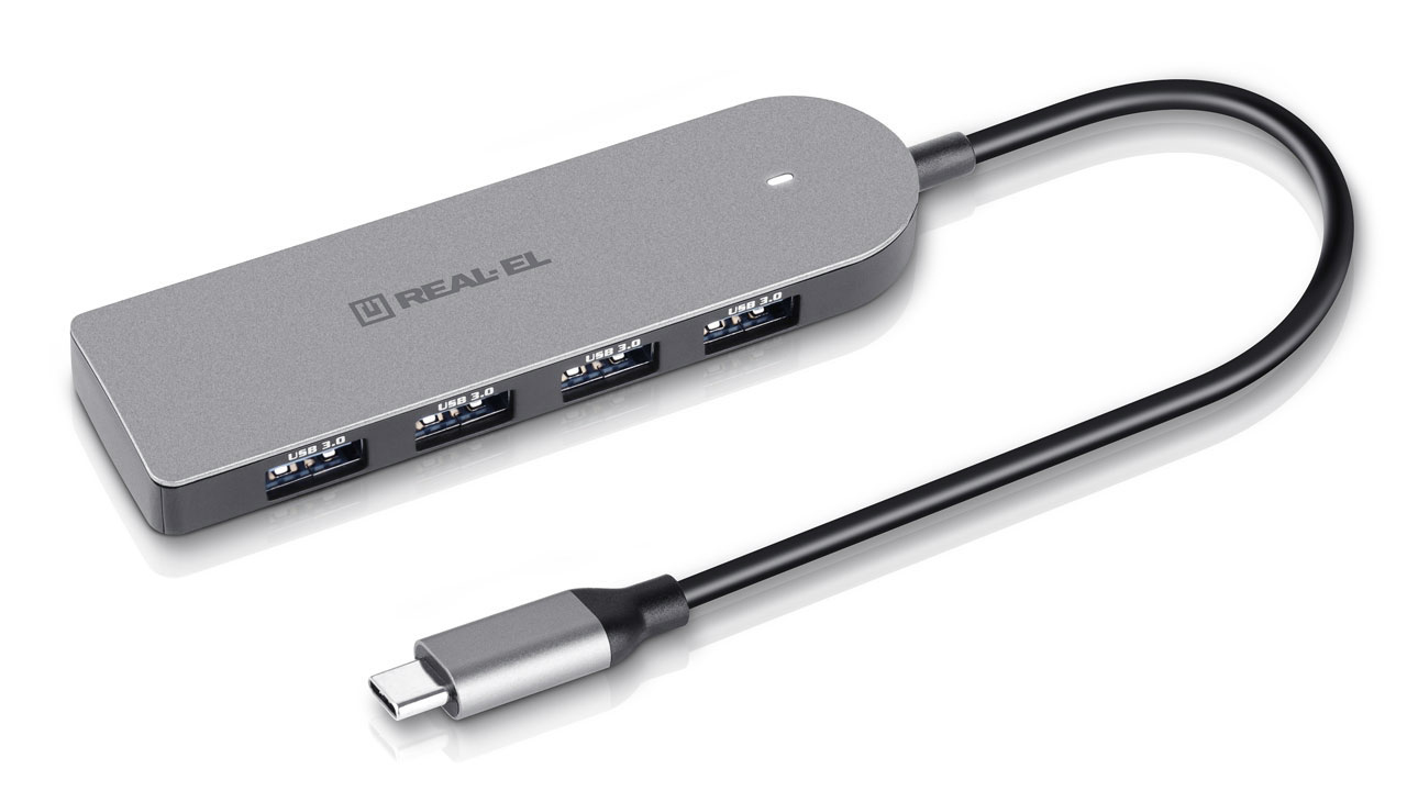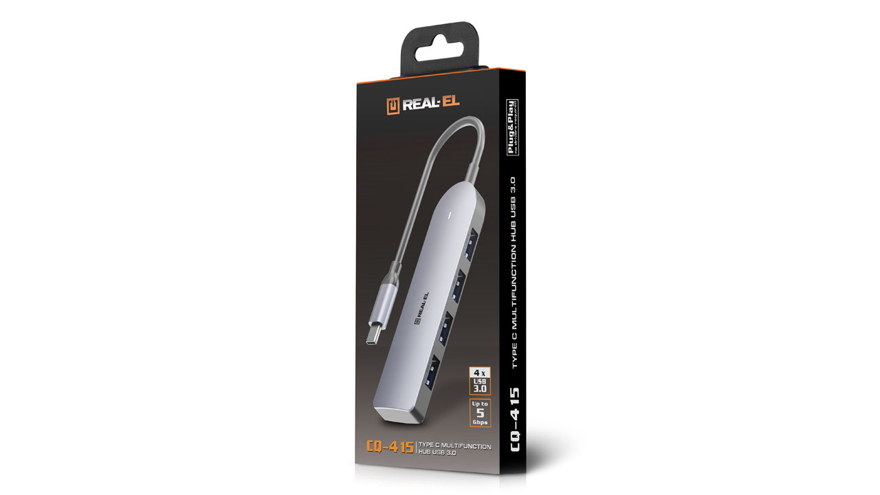 Type C multifunktsionaalne USB 3.0 hub REAL-EL CQ-415 on mõeldud kasutamiseks kõigi seadmetega, mis toetavad ühendust Type C pordi kaudu ja toetavad kõiki vajalikke andmeedastusprotokolle.