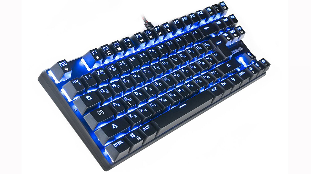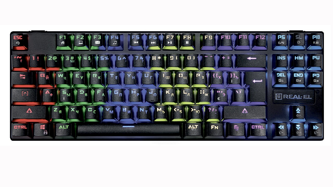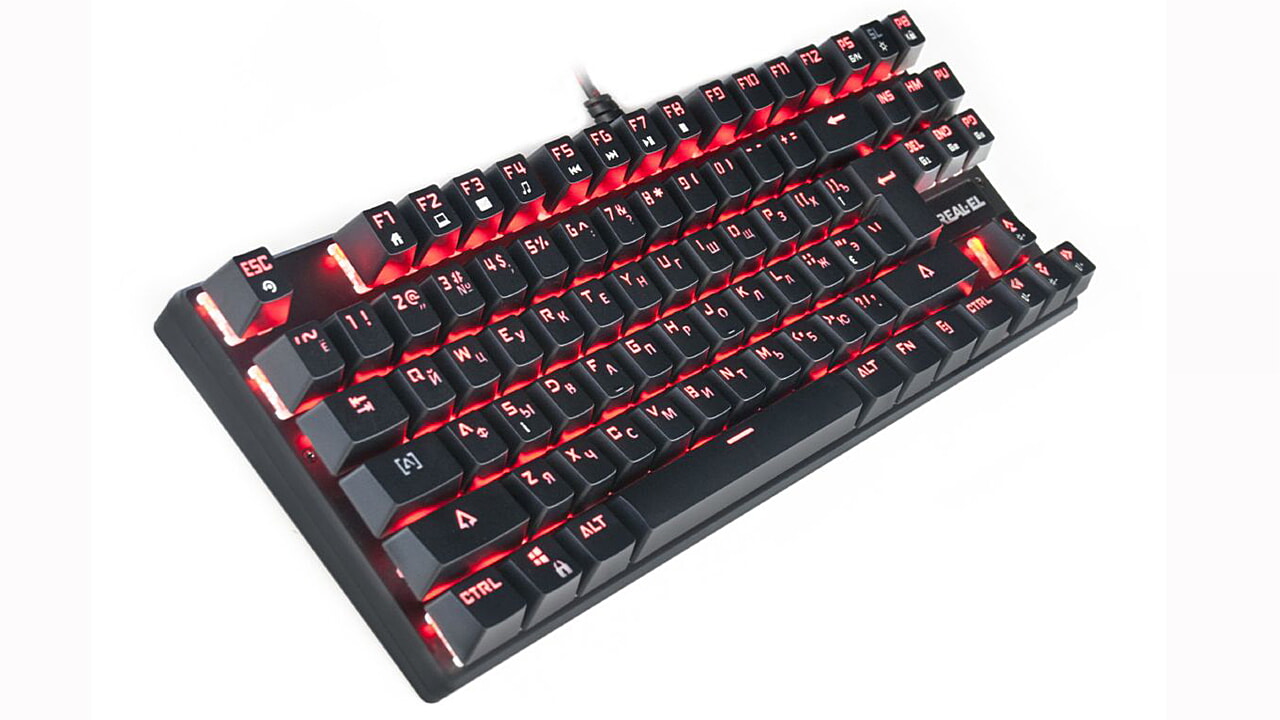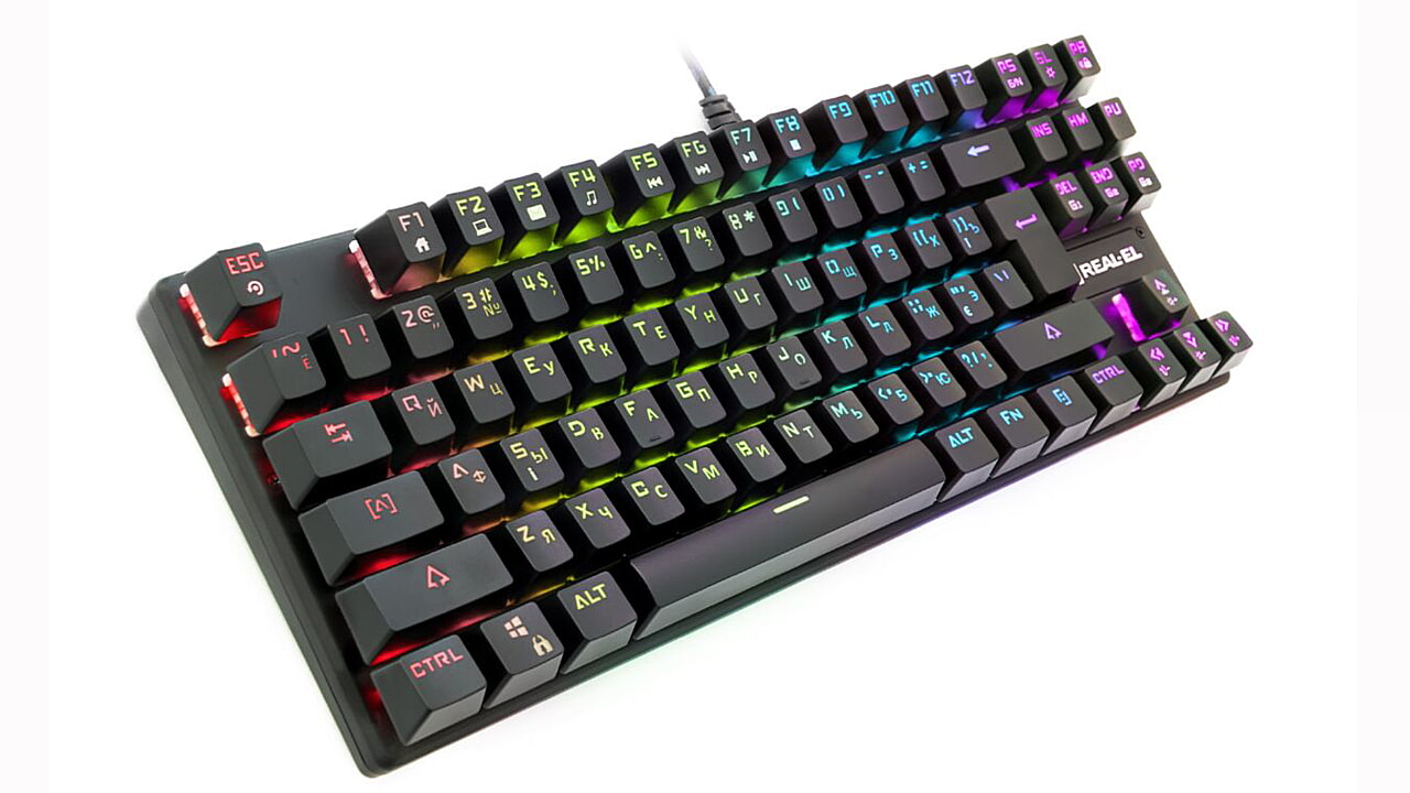 Klaviatuuri REAL-EL M28 TKL RGB eripäraks usaldusväärne mehaaniliste lülitite, kompaktne disainiga metallist alus, NKRO seaded, 8 Fn funktsiooniklahvi kiireks juurdepääsuks Windowsi, Internetti, multimeedia jne.