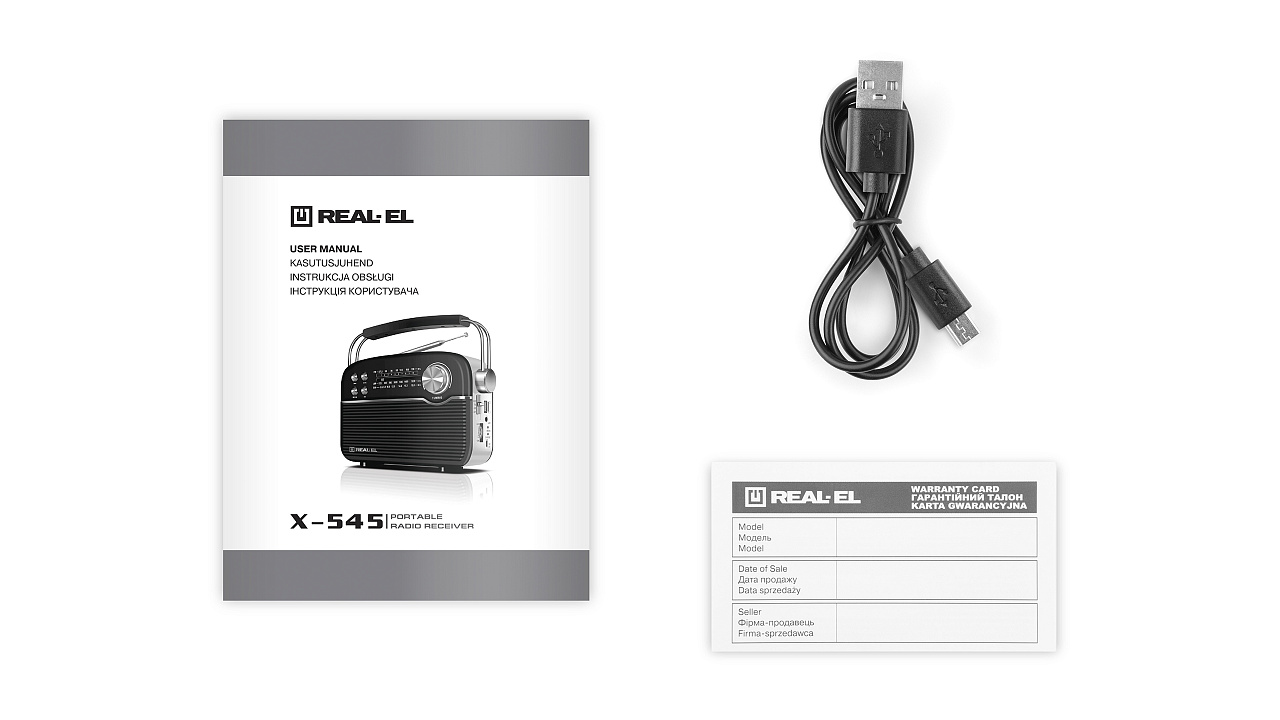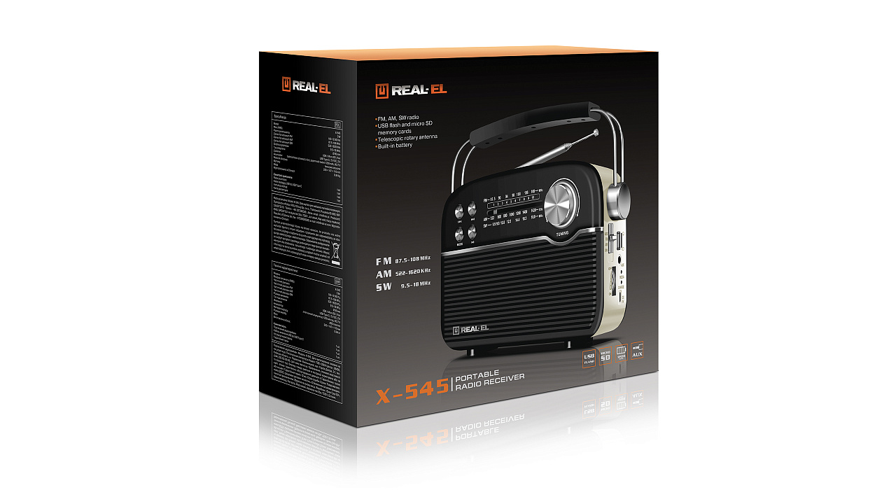Kaasaskantav raadio REAL-EL X-545 on suurepärane kaaslane reisidele, seiklustele ja jalutuskäikudele, samuti suurepärane kaaslane kodus ja tööl. Lisaks sellele, et saate kaasa võtta oma lemmik FM-raadiojaamad kuhu iganes soovite, on vastuvõtja mudelile lisatud kaasaegsed võimalused: esitamine USB-flashilt ja microSD-kaardilt. Sisseehitatud liitiumioonaku tagab raadiosaatja väga pika tööaja.