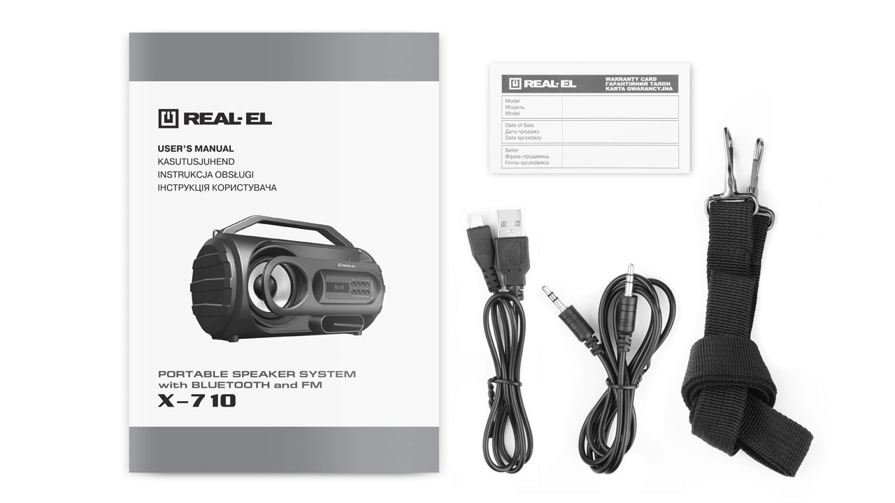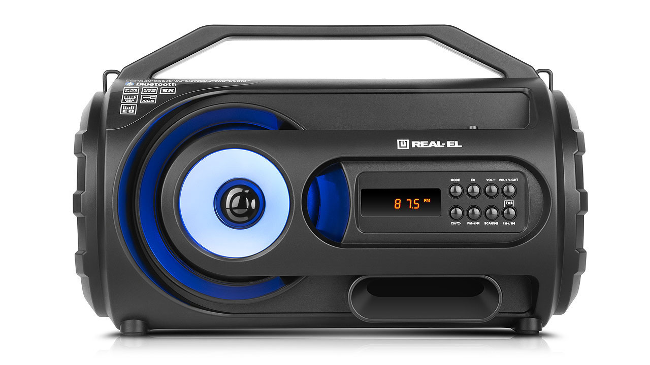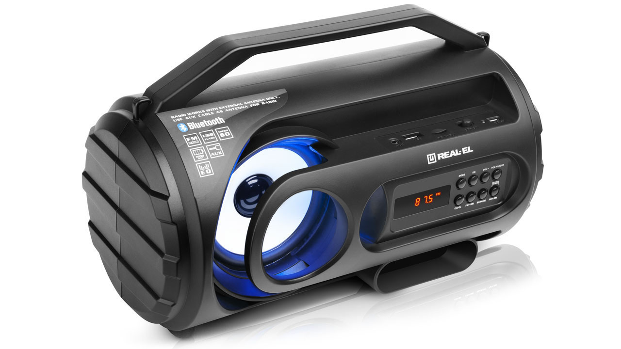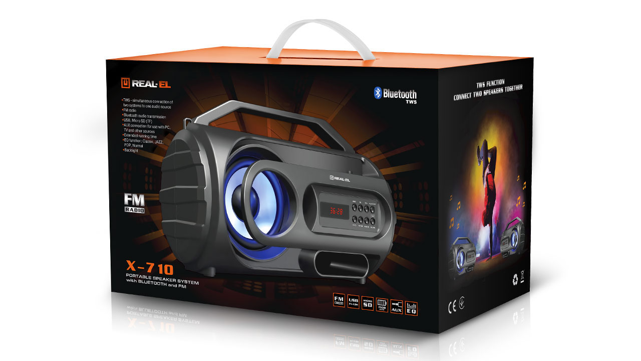 Multimeedia kaasaskantav akustiline süsteem REAL-EL X-710 omab kaasaegset disaini valgustusega ja kvaliteetse heliga. "Boomboxi" lai funktsionaalsus võimaldab kuulata muusikat ühendades mobiilseadme, arvuti, TV, sülearvutid jne, nii AUX väljundi kui ka Bluetoothi kaudu. USB ja Micro SD kaardi pesad võimaldavad kuulata audiofaile flash-mäluseadmetelt. X-710 on suurepärane kaaslane looduses puhkamiseks, 1500 mAh liitiumioonaku tagab muusika väga pikaks ajaks.