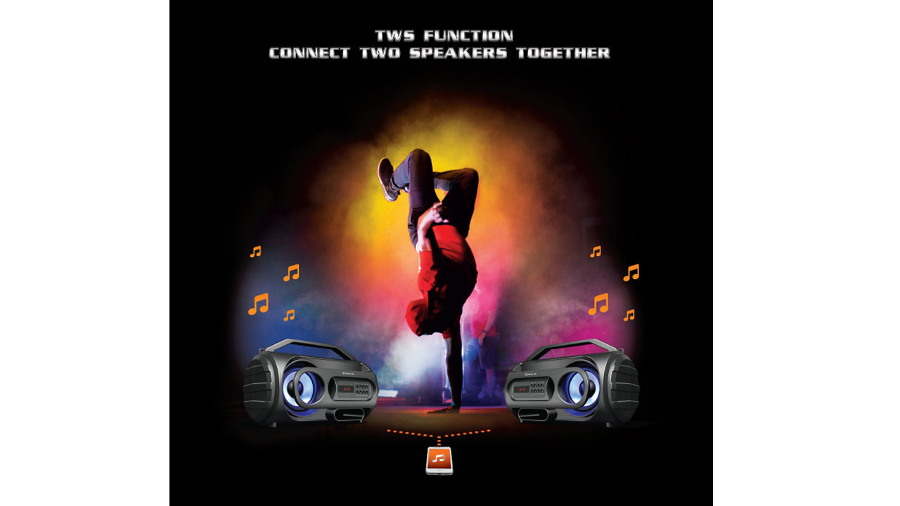 Taasesitus USB-mäluseadmetelt pic Sisseehitatud 1500 mAh aku pic Sisseehitatud raadio pic Taasesitus Mikro SD-kaartidelt pic AUX liini sisend pic Sisseehitatud ekvalaiser pic Võimaldab kahel eraldi Bluetooth-seadmel töötada stereorežiimis pic LED-taustvalgus pic Vedelkristallkuvar pic