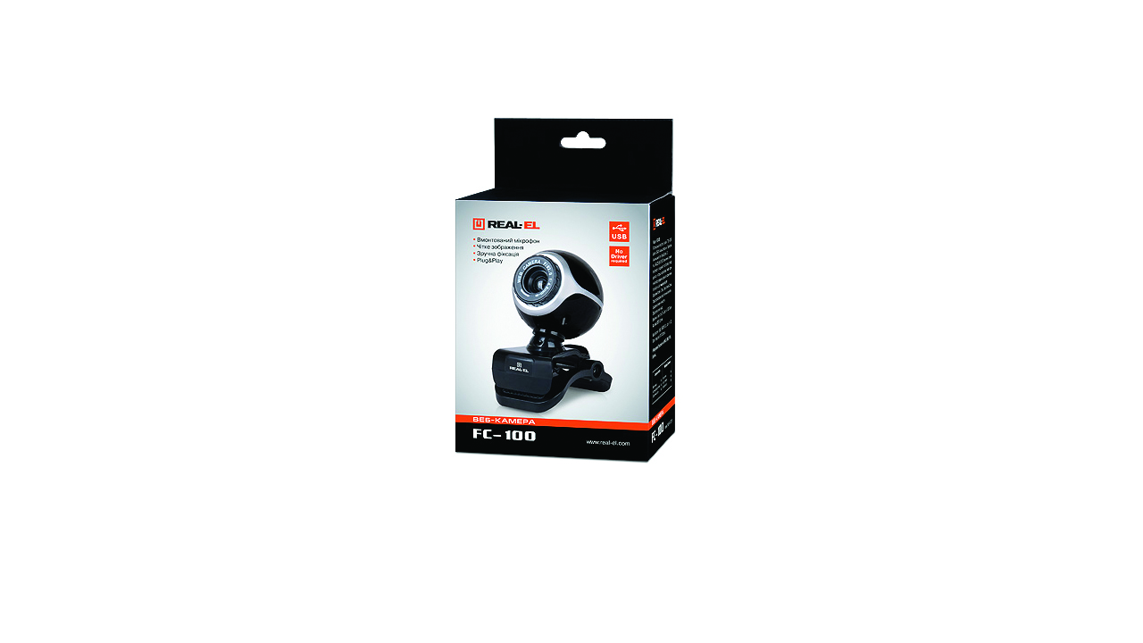 Veebikaamera REAL-EL FC-100 kuulub keskklassi. Sellel on sisseehitatud mikrofon ja käsitsi teravustamine. Konstruktsioonis on ettenähtud mugav kinnitusklamber kaamera paigaldamiseks liigendile kaamera pööramiseks vajaliku nurga all. Mudeli disain on klassikaline. Kaameral on USB-liides ja see toetab tehnoloogiat Plug&Play.