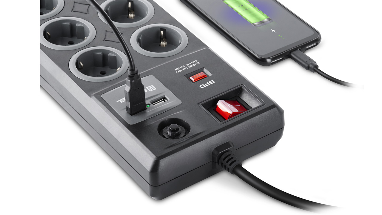 Filtris on 8 maandatud ja kaitsekattega pistikupesa, mis muudab selle mugavaks mitme seadme ühendamiseks korraga. Samuti on sellel kaks USB-porti mobiilseadmete laadimiseks, mis muudab selle veelgi mitmekülgsemaks.