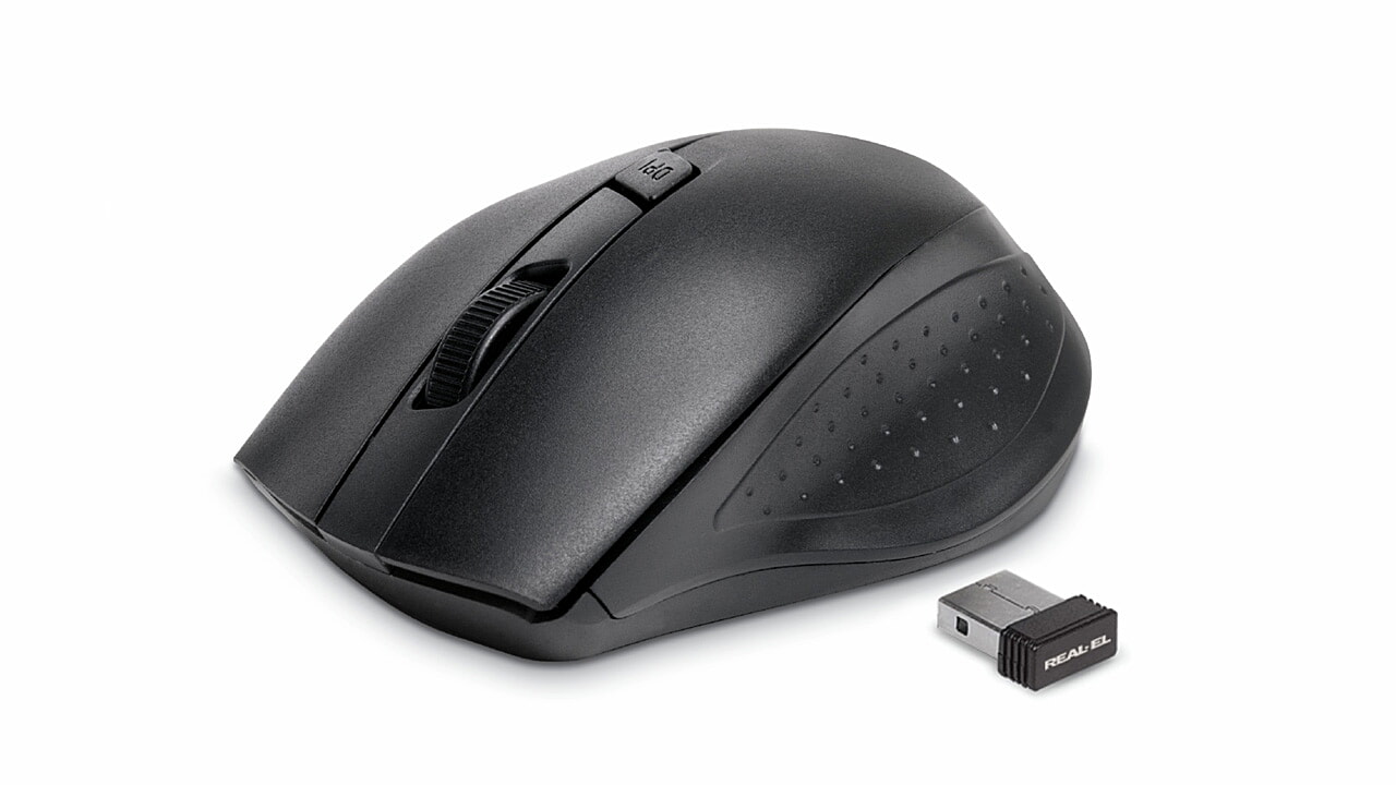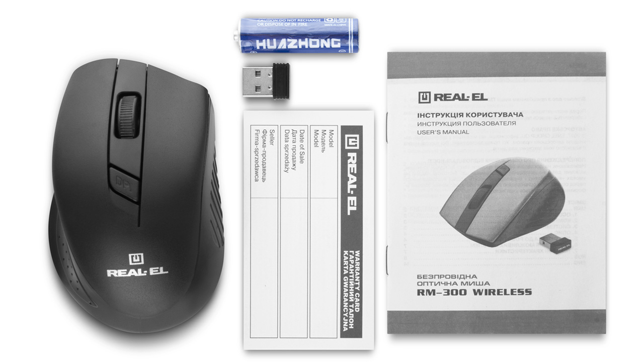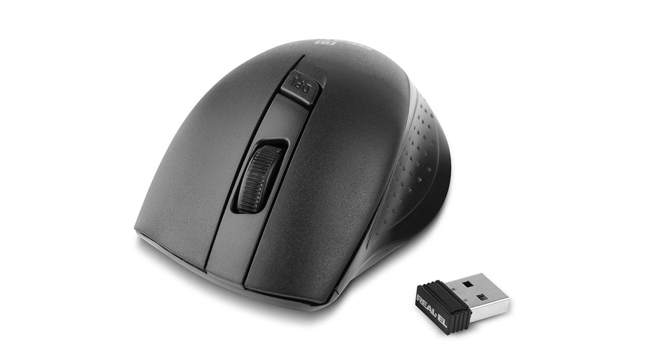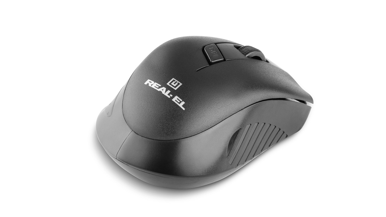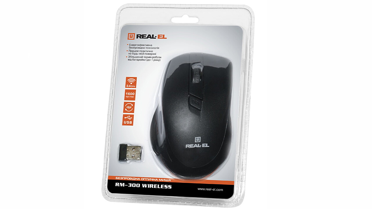 Energy-efficient wireless technology allows the REAL-EL RM-300 Wireles mouse to work practically on any surface. Features: 3 + 1 buttons, stylish ergonomic design, scroll wheel, resolution switch button, USB interface, extended battery life (up to 1 year).