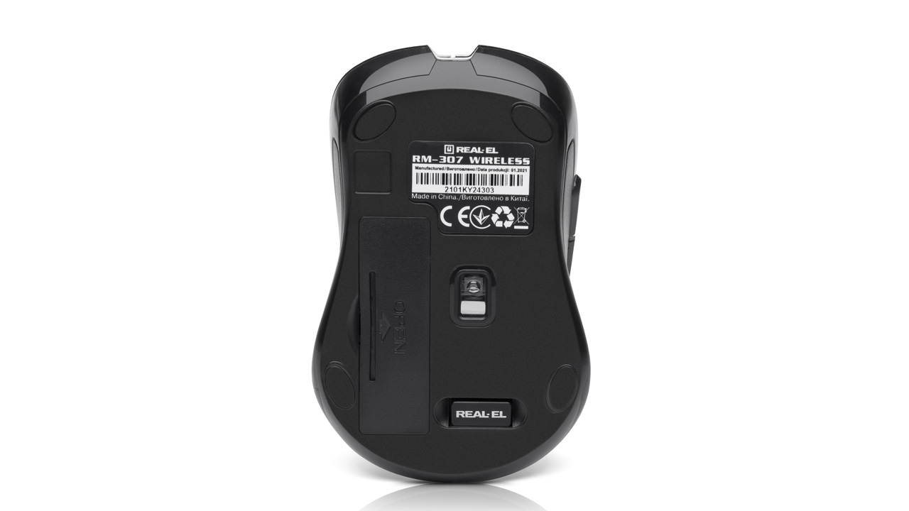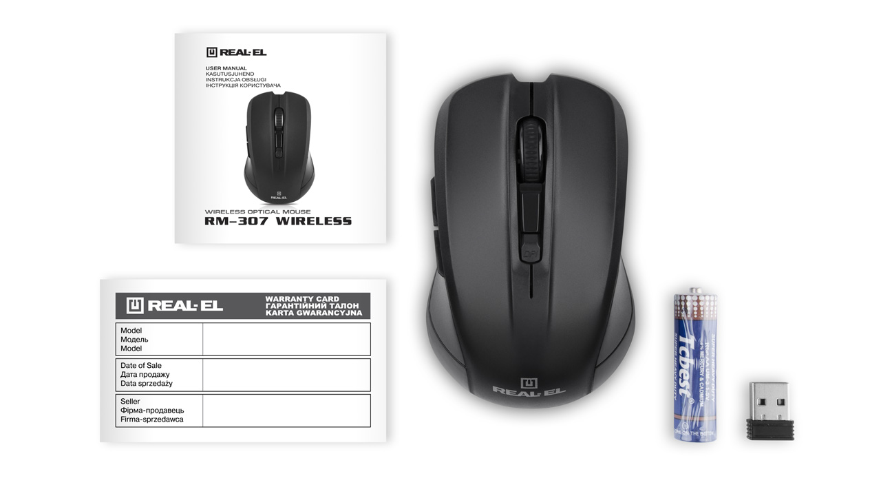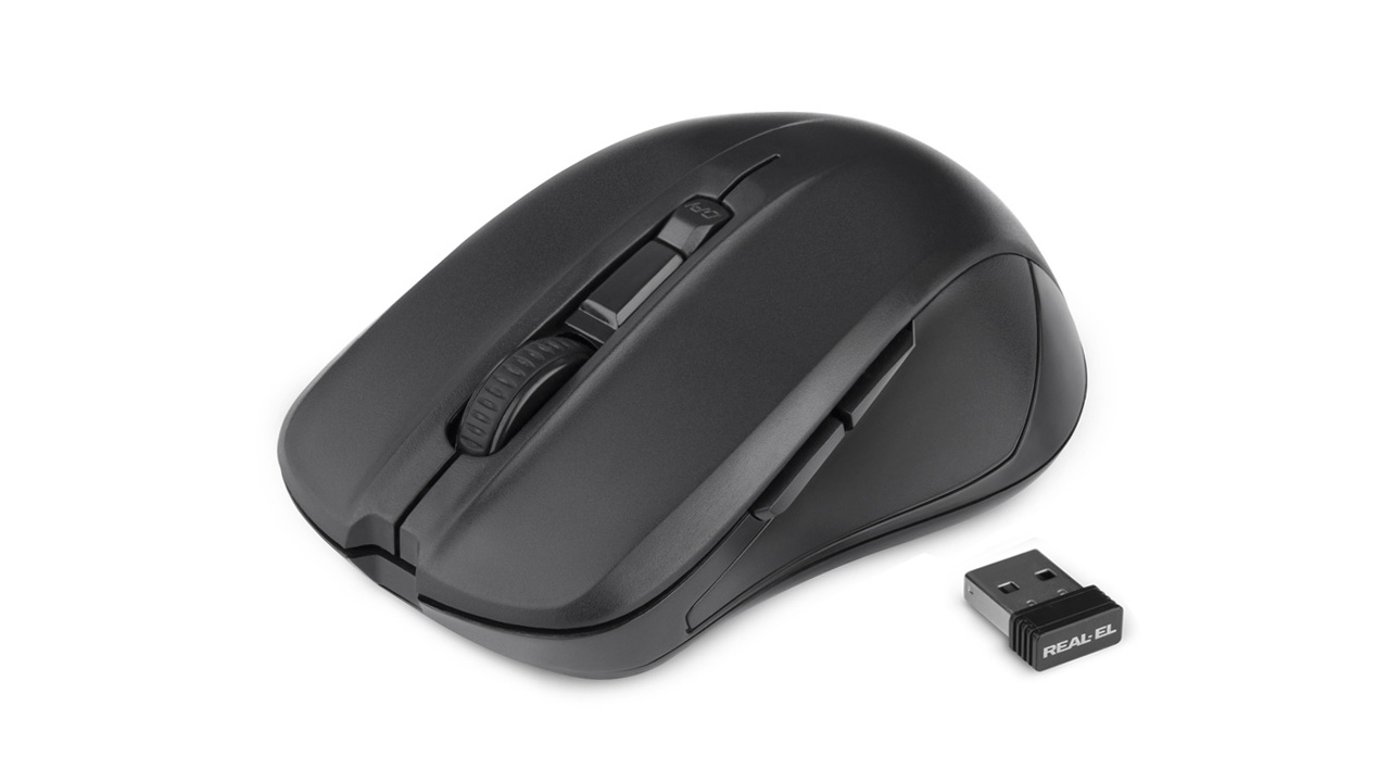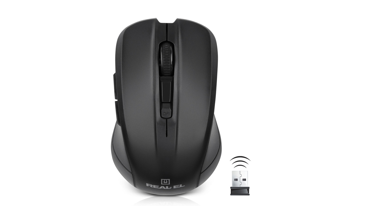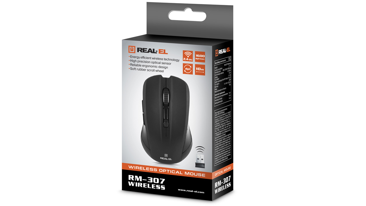Energy-efficient wireless technology allows the REAL-EL RM-307 Wireless mouse to work practically on any surface. Features: 5 + 1 buttons, stylish ergonomic design, scroll wheel, resolution capability - 1600 dpi, USB interface, long battery life.