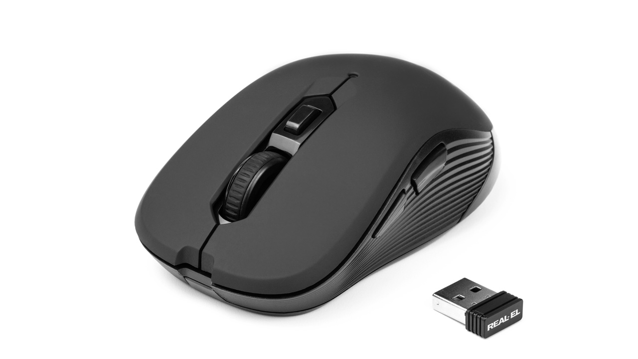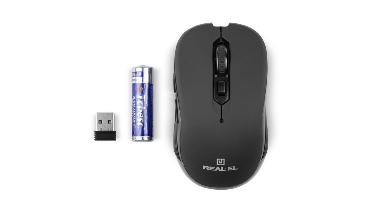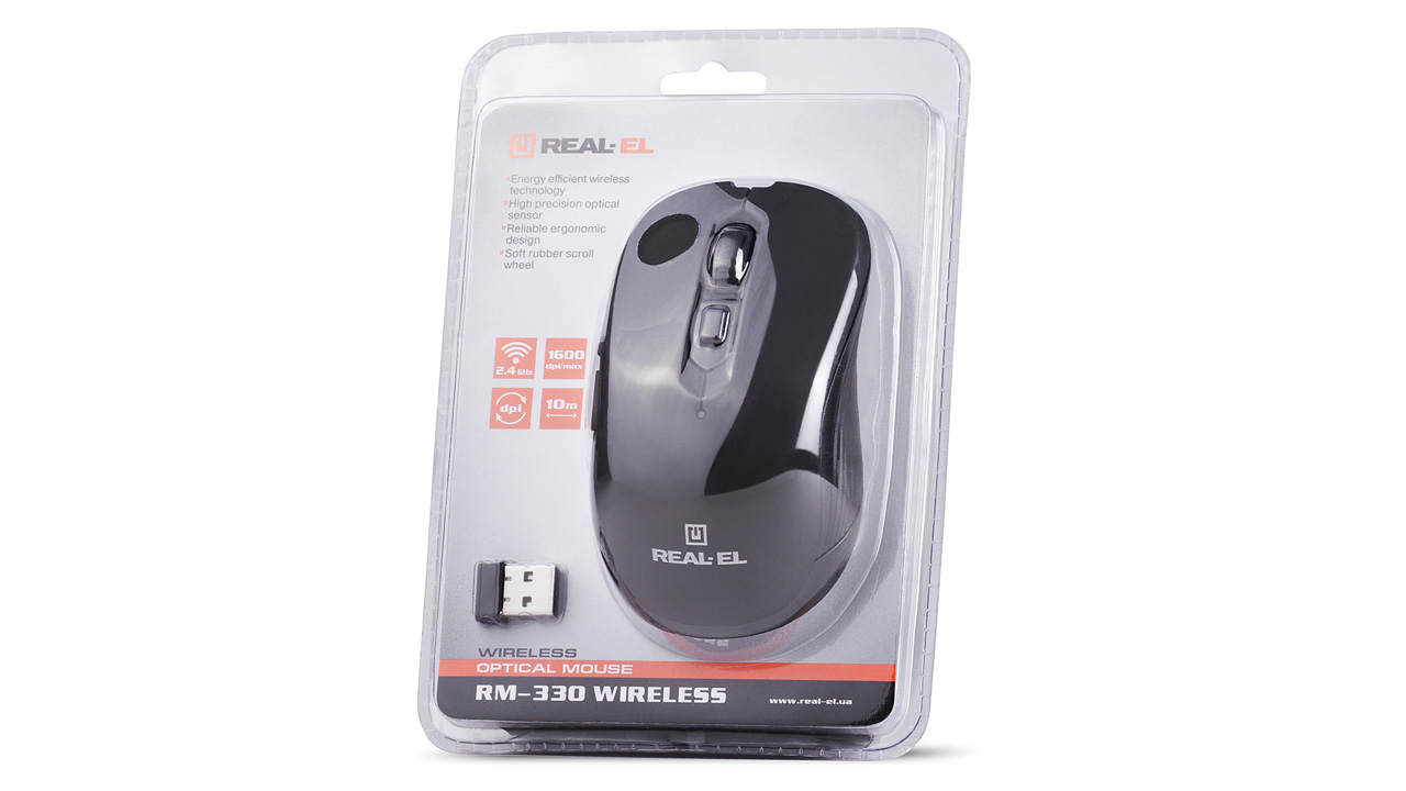 Energy-efficient wireless technology allows the REAL-EL RM-330 Wireless mouse to work practically on any surface. Features: 5 + 1 buttons, stylish ergonomic design, scroll wheel, resolution capability - 1600 dpi, USB interface, long battery life.