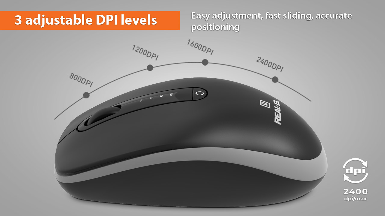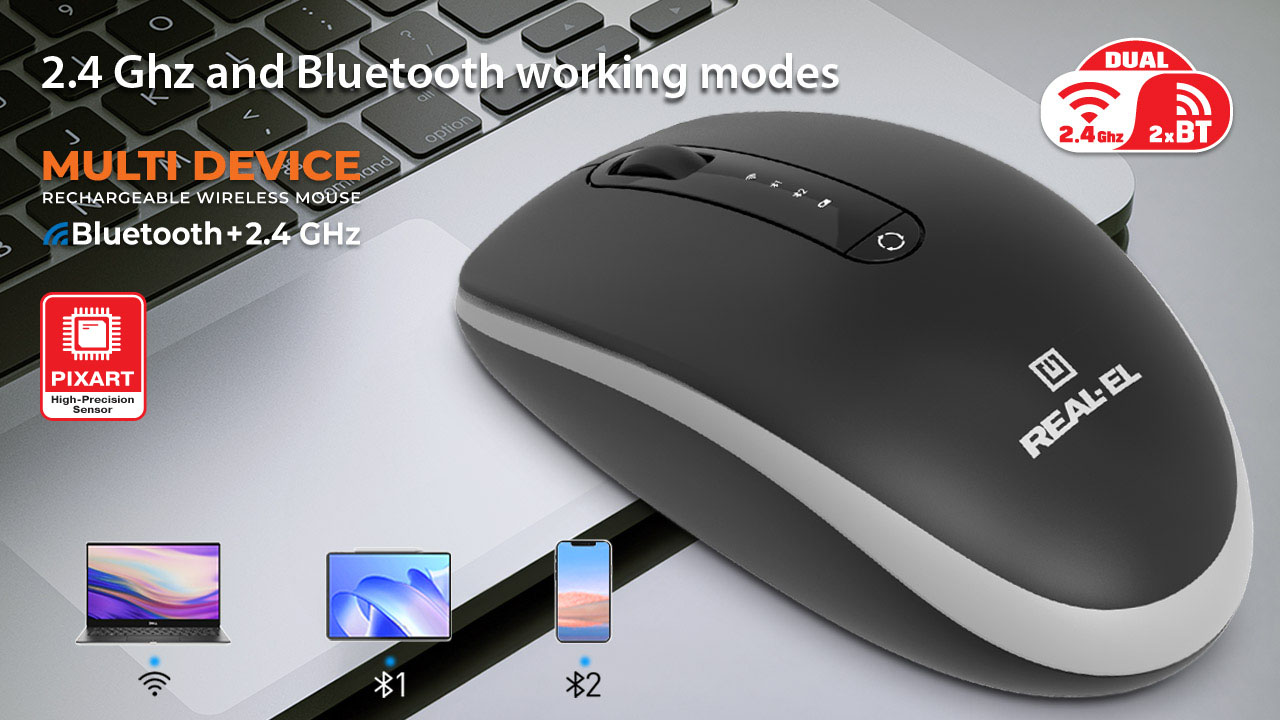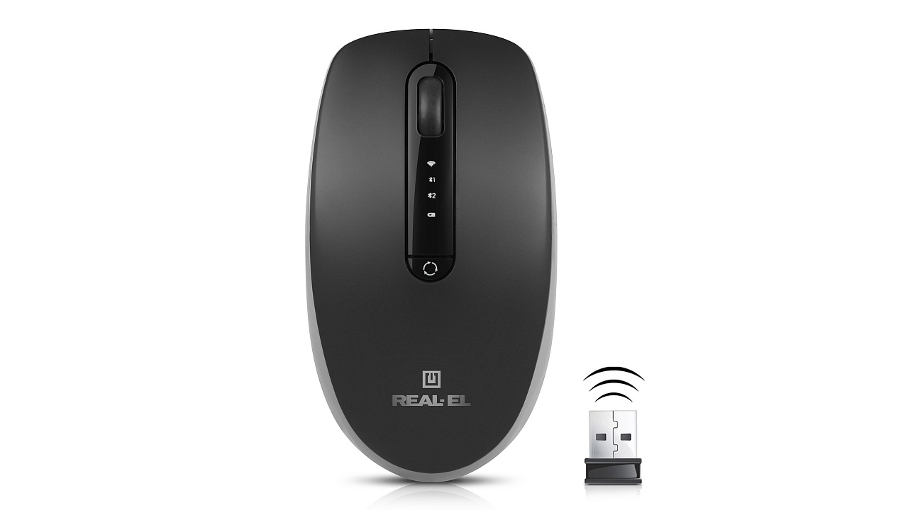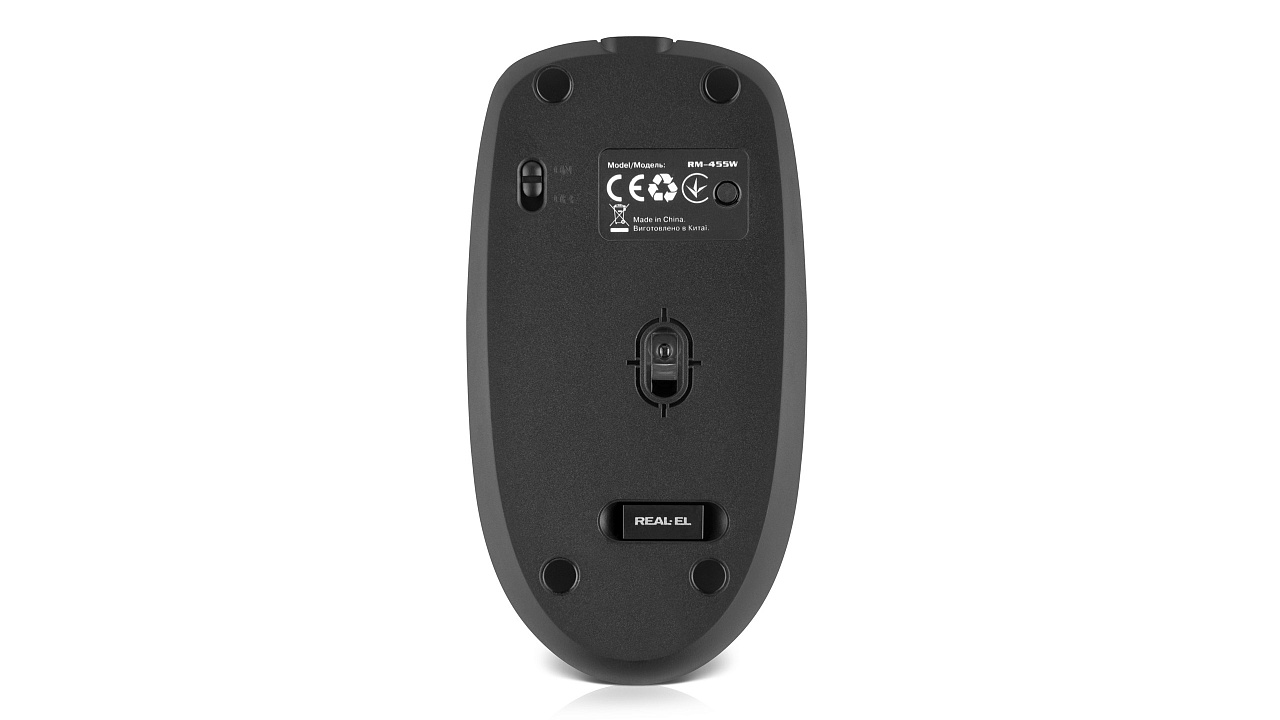 Energy-efficient wireless technology allows the REAL-EL RM-455 W mouse to work on practically any surface. Features: 3 + 1 buttons, stylish ergonomic design, scroll wheel, resolution capability - 2400 dpi.