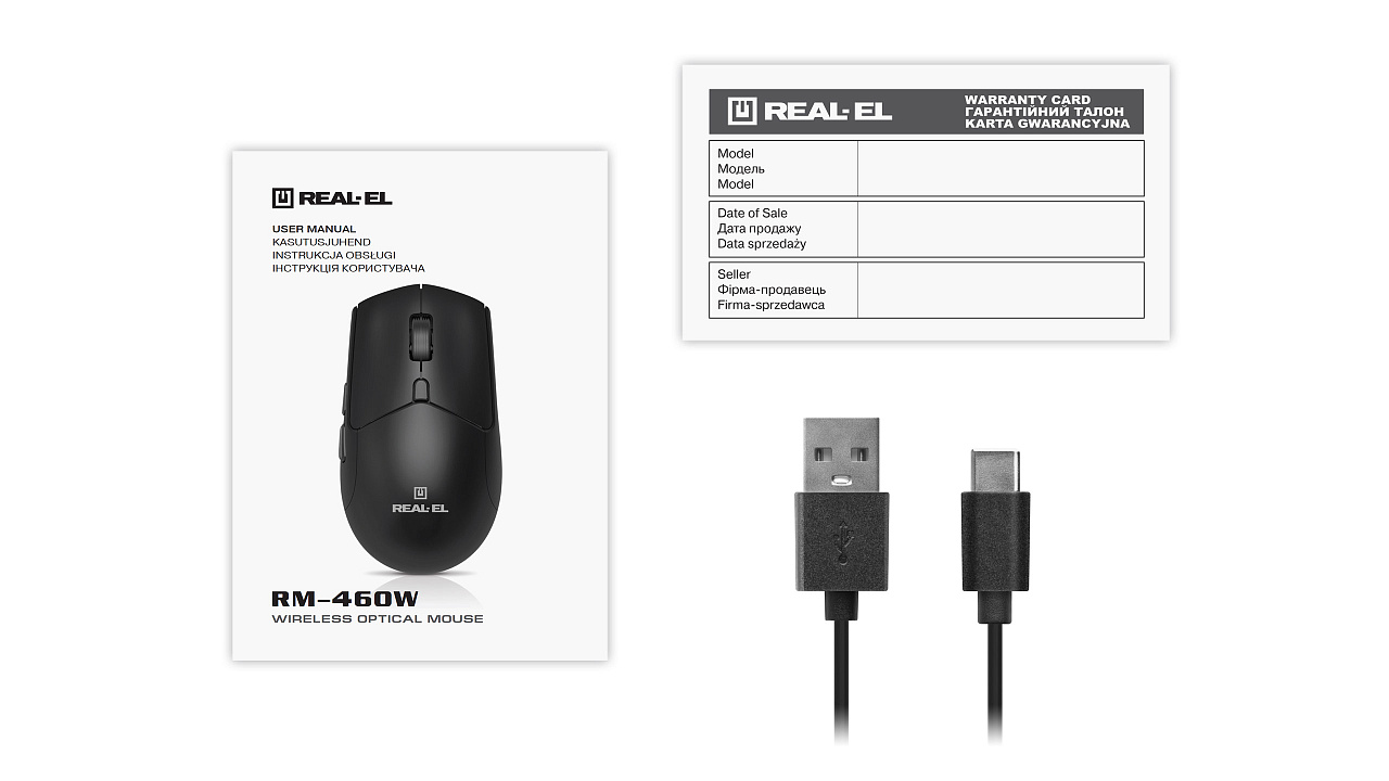 Energy-efficient wireless technology allows the REAL-EL RM-460 W mouse to work on practically any surface. Features: 5 + 1 buttons, stylish ergonomic design, scroll wheel, resolution capability - 2400 dpi.