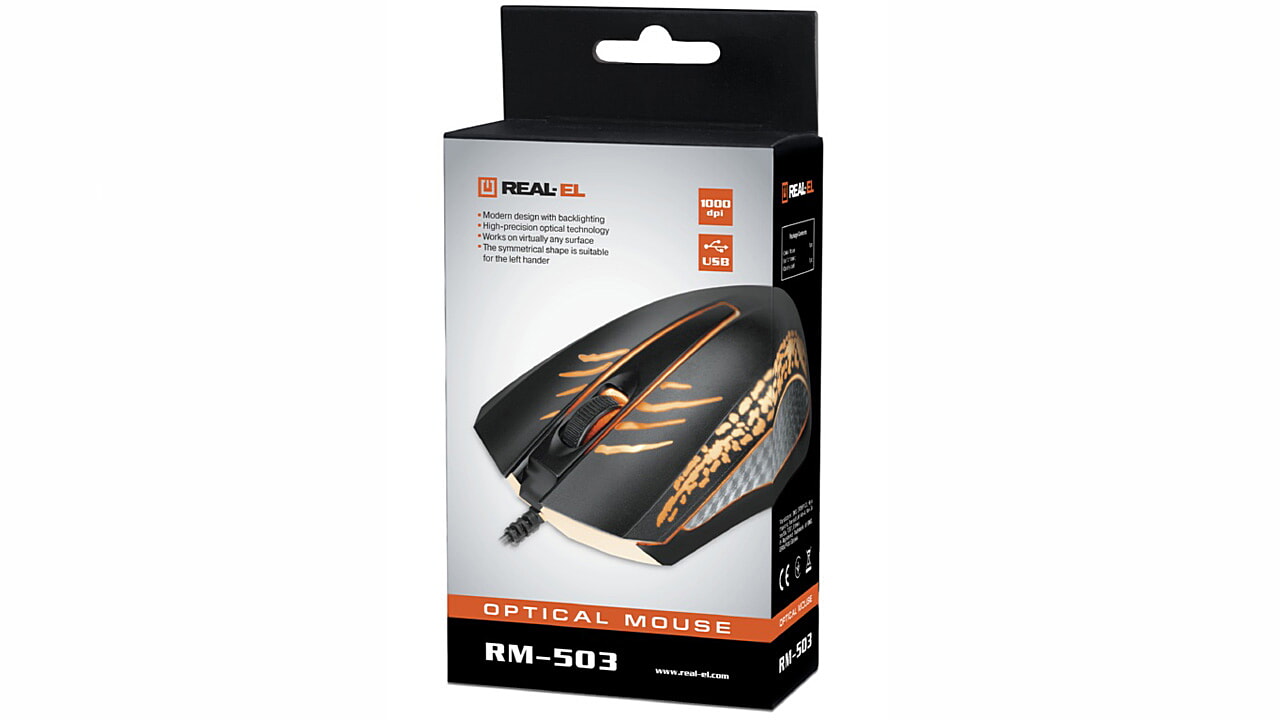 High-precision optical technology allows the REAL-EL RM-503 mouse to work on almost any surface. Features: 2 + 1 buttons, ergonomic design, backlighting, scroll wheel, USB interface, natural shape of the mouse is comfortable for the hand.