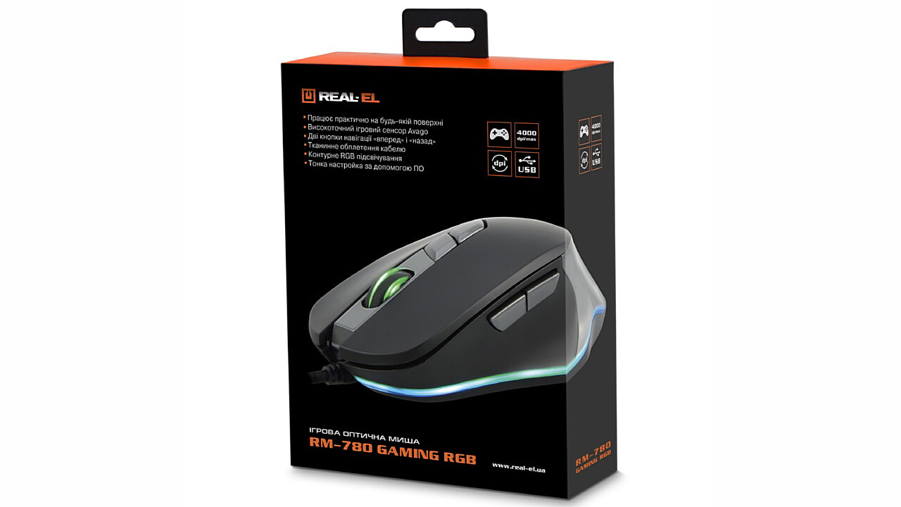 The high-precision Avago gaming sensor allows the REAL-EL RM-780 Gaming mouse to work on practically any surface. Features: maximum mouse resolution - 4000 dpi, fabric cable braiding, contoured RGB backlighting, fine-tuning with software.