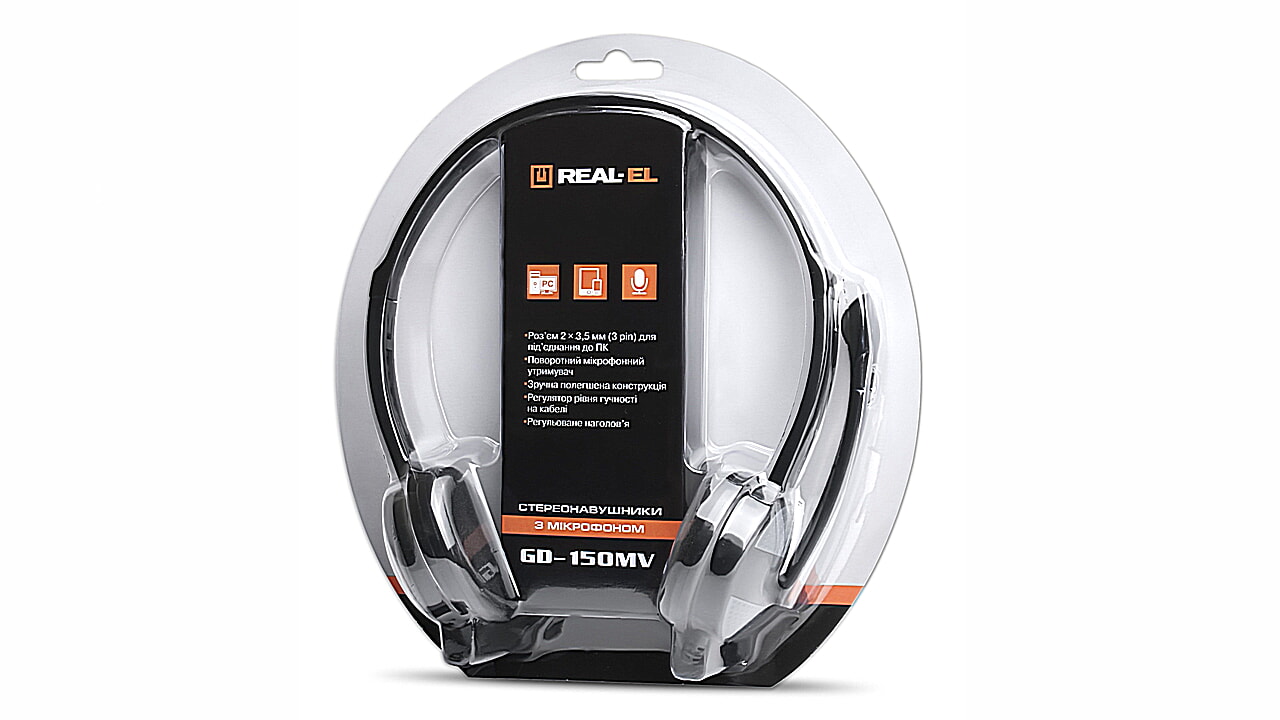 REAL-EL GD-150MV stereo headphones with microphone are designed for operation with mobile devices and other compatible systems. They can be also used in VoIP telephony, video conferencing, for speech recognition and learning foreign languages.