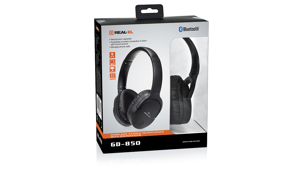 Wireless stereo headphones with microphone REAL-EL GD-850 reproduce high-quality clear sound, perfect for listening to music, watching videos, communicating, and gaming. The headset is lightweight and compact, made of durable plastic that does not leave fingerprints.