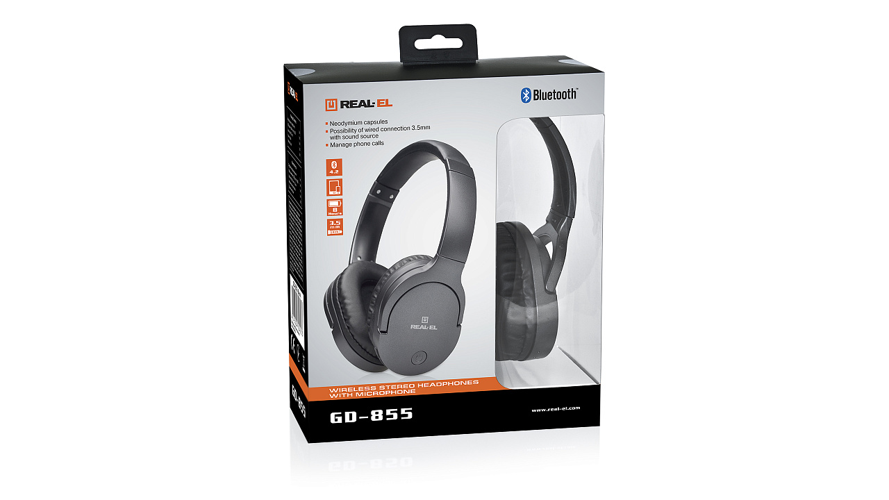 Wireless headphones with microphone REAL-EL GD-855 reproduce high-quality clean sound, perfect for listening to music, watching videos, communicating, and gaming. The headset is lightweight and compact, made of durable plastic that doesn't leave fingerprints.
