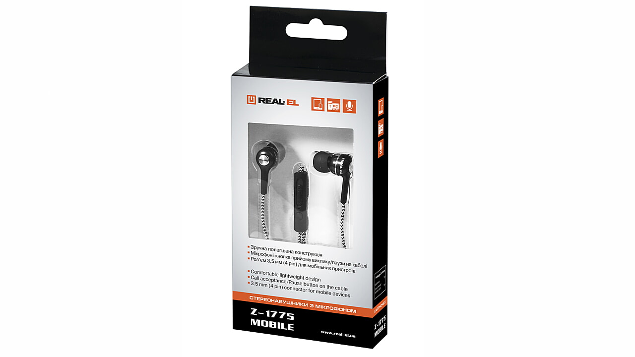 Headphones with a microphone REAL-EL Z-1775 Mobile are designed to work with compatible systems (portable players, computer gaming consoles, etc.). They can also be used for internet telephony, conducting video conferences, speech recognition, and foreign language learning.