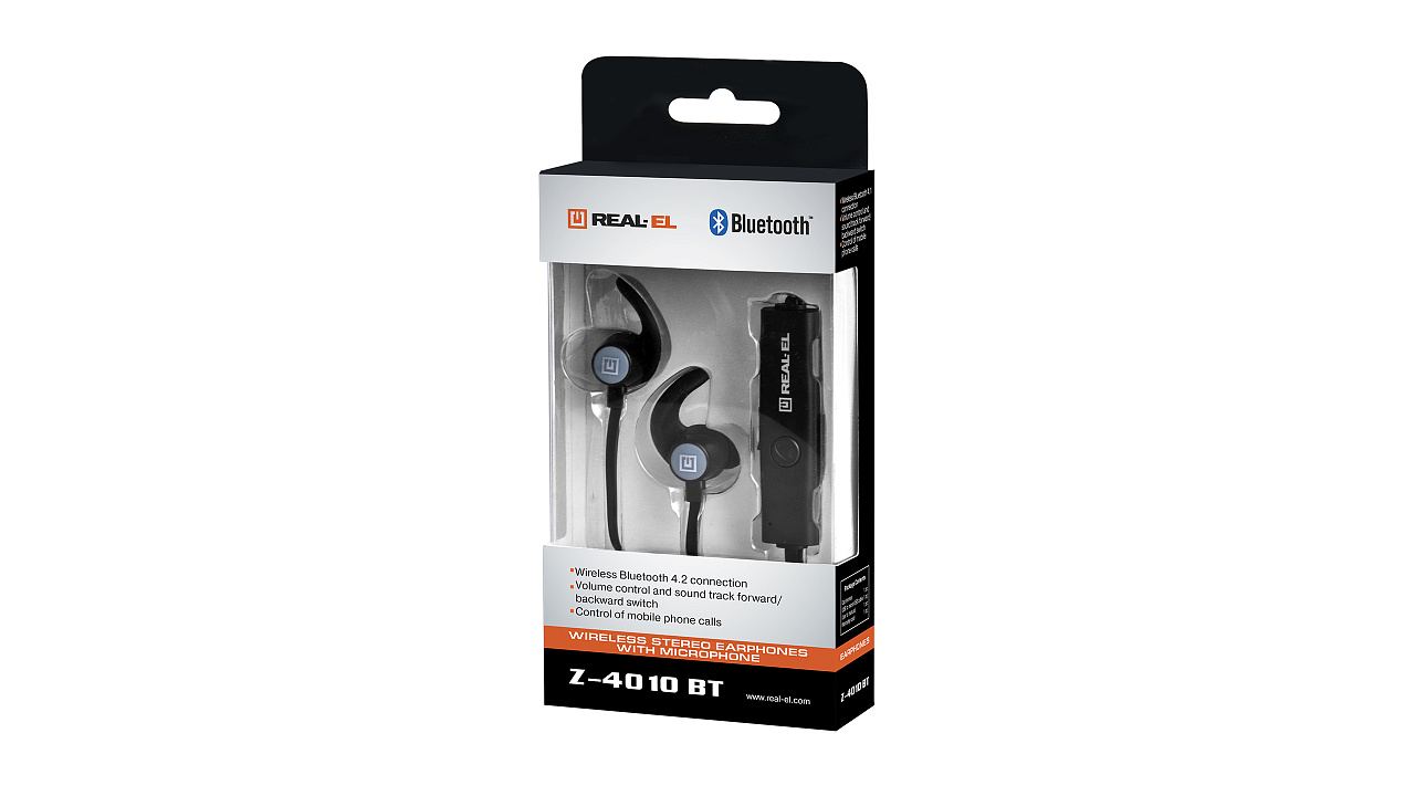 REAL-EL Z-4010 BT wireless stereo earphones with a microphone are designed for operation with compatible systems (PC, notebooks and other mobile devices) by data transmission via Bluetooth protocol.
