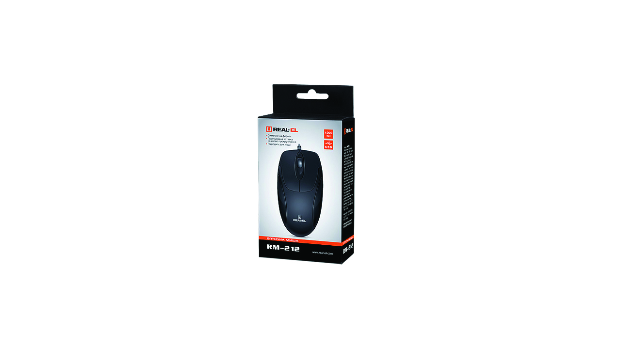 Ülitäpne optiline tehnoloogia võimaldab arvutihiirel REAL-EL RM-212 töötada praktiliselt igal pinnal. Eriomadused: 2 + 1 klahvi, sümmeetriline vorm, kerimisratas, kummist vahetükk kerimisrattal, USB-liides, seadme loomulik ehitus on kätele mugav, sobib vasakukäelisele.