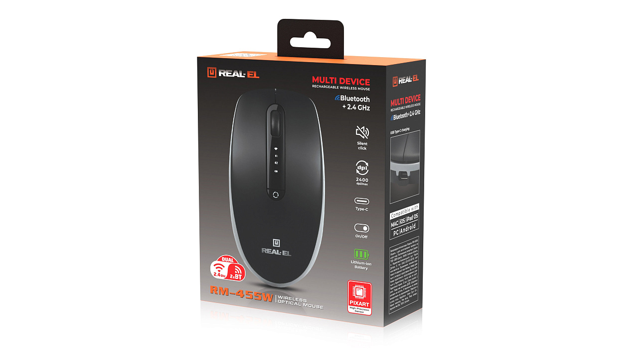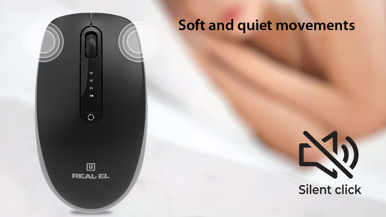 Energiatõhus juhtmevaba tehnoloogia võimaldab REAL-EL RM-455 W hiirel praktiliselt kõigil pindadel töötada. Omadused: 3 + 1 nuppu, stiilne ergonoomiline disain, kererull, eraldusvõime - 2400 dpi.
