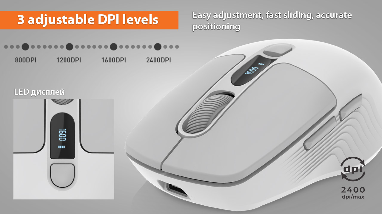 Tänu reguleeritavale sensori eraldusvõimele (800/1200/1600/2400 DPI) tagab hiir täpse ja sujuva liikumise erinevate ülesannete täitmiseks – alates produktiivsest tööst kuni dünaamiliste mängudeni.