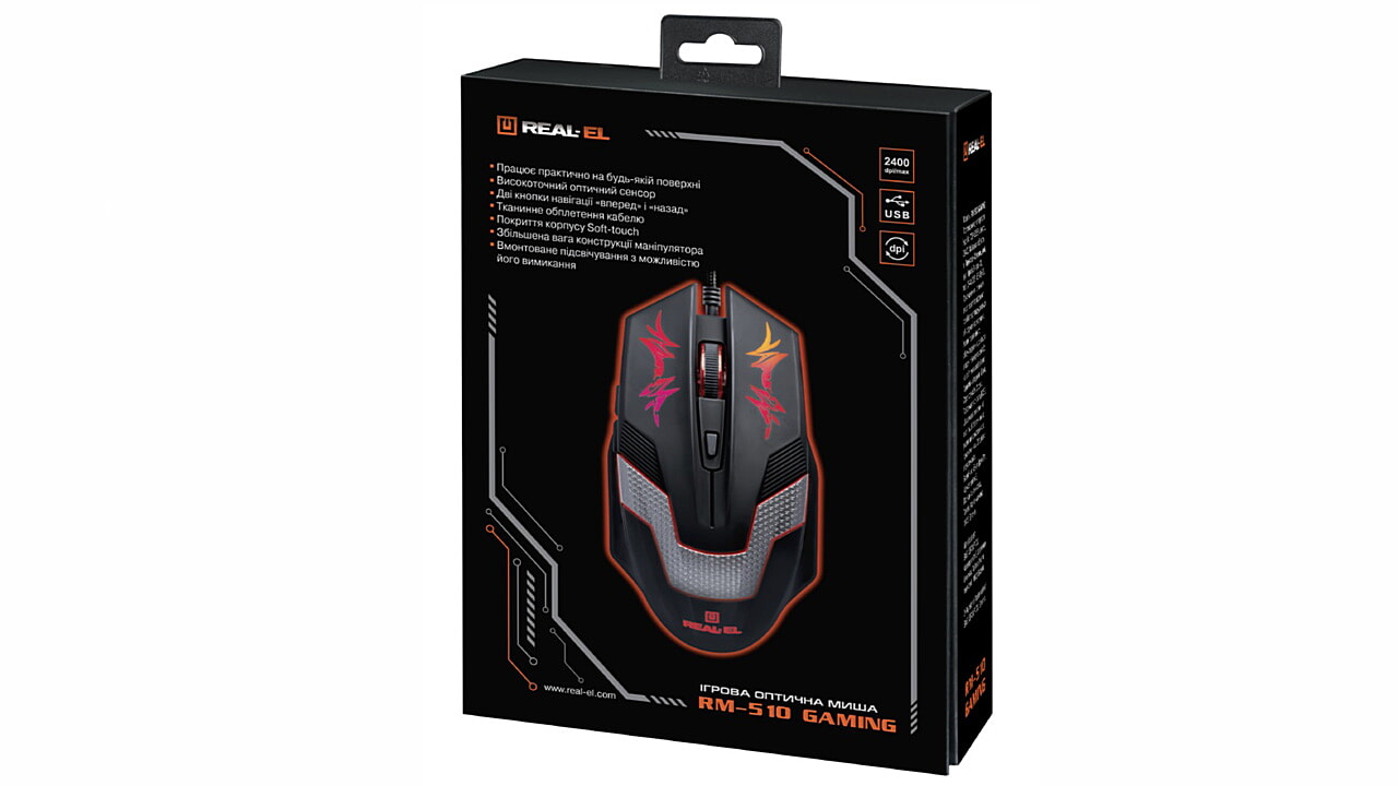 Ülitäpne optiline tehnoloogia võimaldab arvutihiirel REAL-EL RM-510 Gaming töötada praktiliselt igal pinnal. Eriomadused: ülitäpne optiline sensor, 5 + 1 (kerimisratas), topeltklõpsu nupp, kaks navigatsiooninuppu «edasi» ja «tagasi», DPI eraldusvõime ümberlüliti, hiire maksimaalne eraldusvõime – 2400 dpi, kullatud USB-liides, manipulaatori massiivsem konstruktsioon, varjatud võime lülitada esiletõstmine.