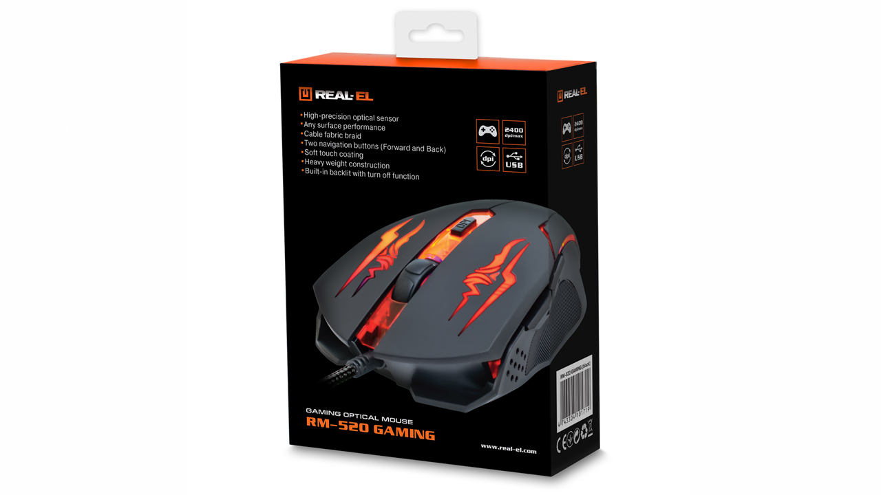Kõrge täpsusega optiline tehnoloogia võimaldab mänguarvuti hiirel REAL-EL RM-520 Gaming töötada praktiliselt igal pinnal. Omadused: kõrge töökiirus, 5 + 1 nuppu, kereratas, 2 navigeerimisnuppu "edasi" ja "tagasi", DPI eraldusvõime lüliti, pehme puutetundliku korpuskattega, sisseehitatud valgustus koos võimalusega see välja lülitada.